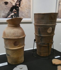 発掘された朝顔形埴輪(左)と円筒埴輪=橿原市の橿原考古学研究所付属博物館