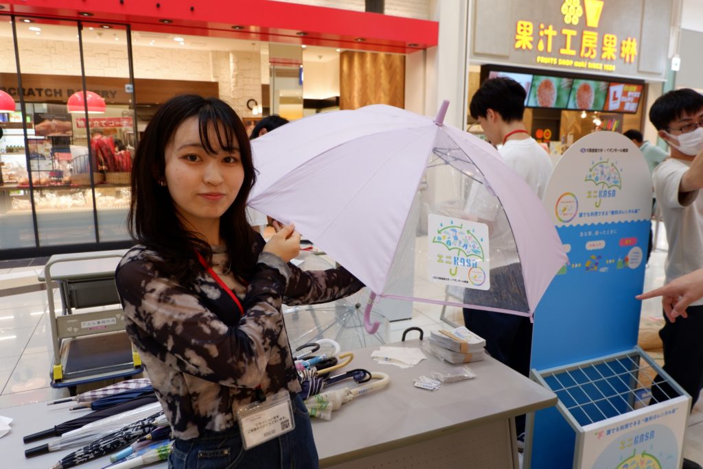 大阪産業大(大阪府大東市)の学生たちが、橿原市の商業施設「イオンモール橿原」で来年7月まで、無料の傘貸し出しプロジェクト「エニKASA」を行っている。急な雨でビニール傘を購入して使い捨てするのではなく、傘を借りてもらうことで、プラスチックごみ削減につなげたい考えで、「この取り組みが世の中に広がってほしい」と話している。