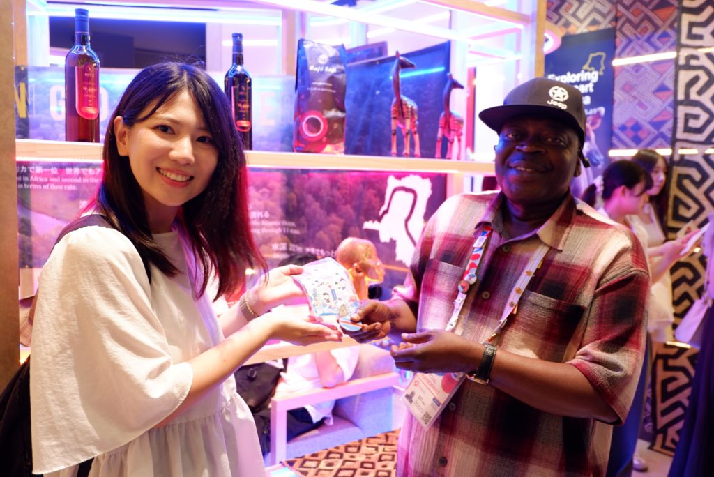 コンゴ民主共和国のスタッフ(右)とピンバッジを交換する王寺町観光協会の職員=大阪市此花区