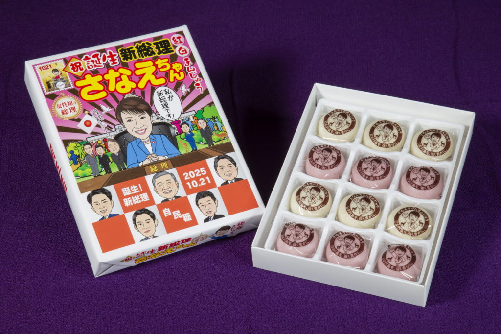 党総裁就任を受けた「祝誕生 新総裁さなえちゃん紅白まんじゅう」は3千個が完売し、好評を受けてパッケージなどを新総理バージョンに進化させた。歴代首相をモチーフにした菓子のメーカー「大藤」(東京都荒川区)が製造。女性初の総理大臣の誕生を祝うとともに、故郷との強い絆を「奈良の女」と語る高市氏の思いを形にしたという。