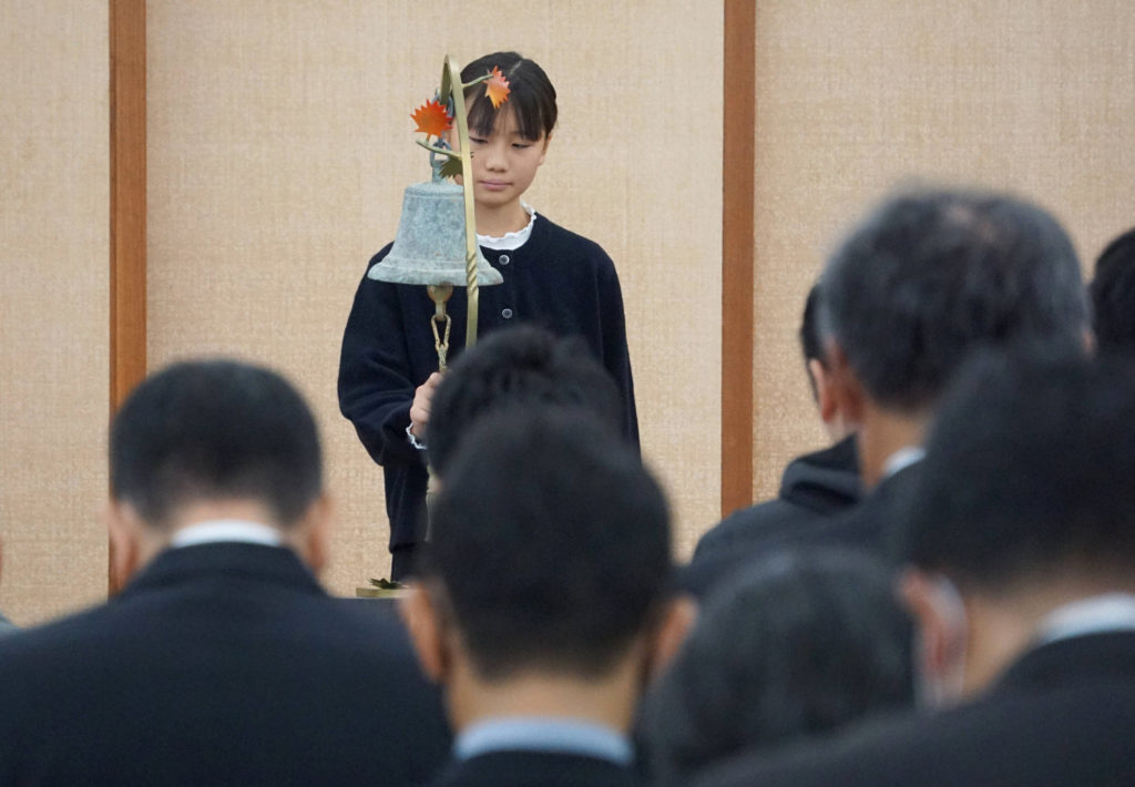 有山楓ちゃんが通った奈良市立富雄北小の児童が弔鐘を鳴らす中、黙禱する出席者ら=11月16日午前、奈良市役所(西川博明撮影)