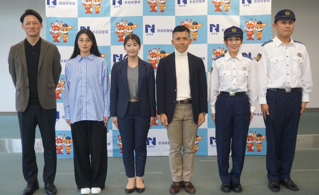 11日に奈良市の県警本部で行われた発表会では、ノーネクタイの制服姿の警察官2人や、オフィスカジュアルの服装を身に着けた職員4人が登場。それぞれのファッションを披露した。