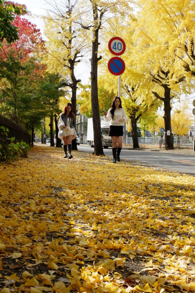 今は黄色と黄緑色のグラデーションが楽しめるが、歩道に落ちた葉が黄金のじゅうたんのように見え、カメラを向ける人の姿も。市産業振興課によると、見頃は今月末まで。