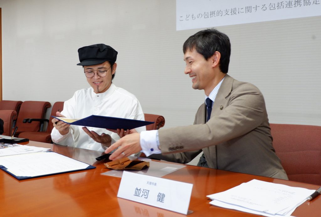 連携協定を締結する吉田田タカシさん(左)と天理市の並河健市長=同市
