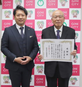 感謝状を手にする西辺豊彦さん(右)と山田秀士市長=御所市役所(同市提供)