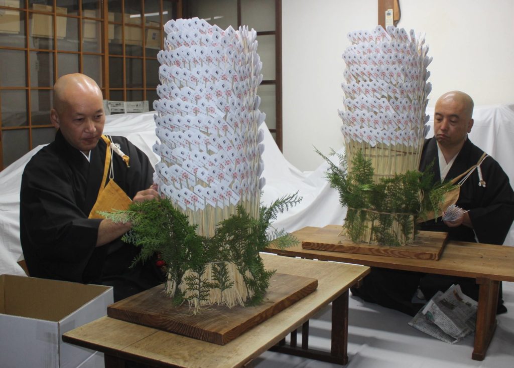 千手観音守護札(縦8㌢、横2・5㌢)は開運や所願成就の御利益があるとされ、財布に入れたり玄関のかもいに差したりする。この日は、僧侶らが竹串に挟んだお札を「ボテ」と呼ばれるわらの束に丁寧に差し込んでいった。