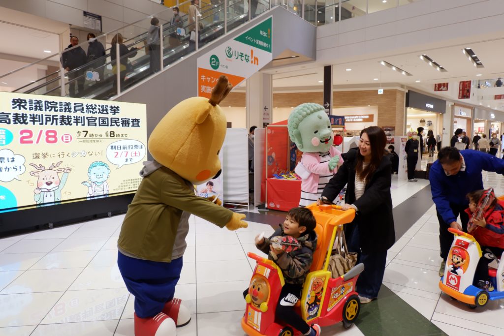 買い物客に投票を呼びかける選挙啓発キャラクター=大和郡山市