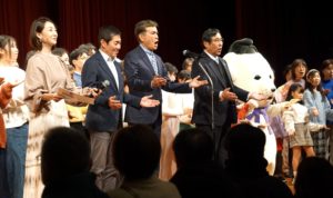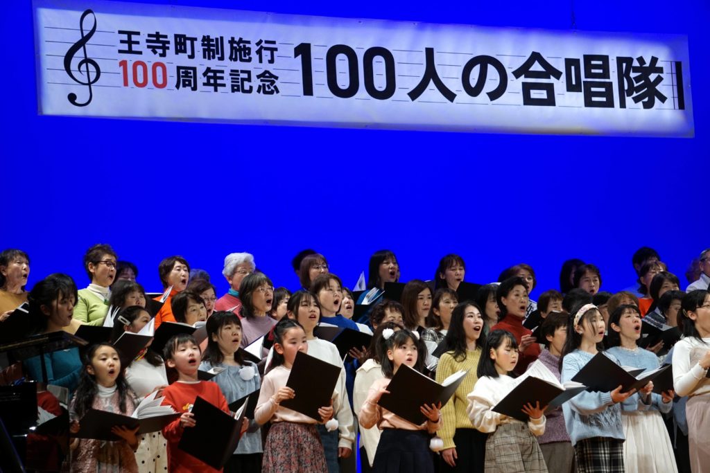 最後は石原さんが音頭をとる形で、100周年を祝う「一丁締め(関東一本締め)」が行われた。このほか、町民100人の合唱隊が同町出身のフォルクローレ歌手、秋元広行さんの作詞・作曲による記念曲「100年目の王寺へ」など3曲を歌って披露した。