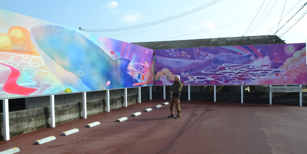 ウォールアートは高さ約2・4㍍、長さ約23㍍。「くじらのゆめ」と題され、クジラが海から跳び出て空に向かう様子がカラフルに描かれている。