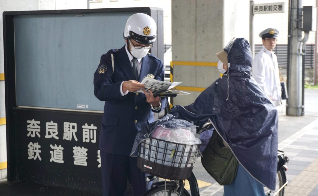 自転車利用者に「青切符」制度の説明を行う県警の警察官=奈良市のJR奈良駅前