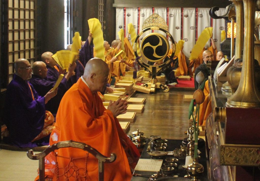 開白大般若転読法要は、本堂の高さ約10㍍の本尊・十一面観音菩薩立像(重要文化財、室町時代)を前に始まり、同寺の川俣海淳化主が法要の趣旨を盛り込んだ表白を読み上げた。このあと、観音像造立当時の故事にちなみ僧侶らが大般若経600巻を転読。アコーディオンのように経本を開いたり閉じたりする所作を繰り返した。
