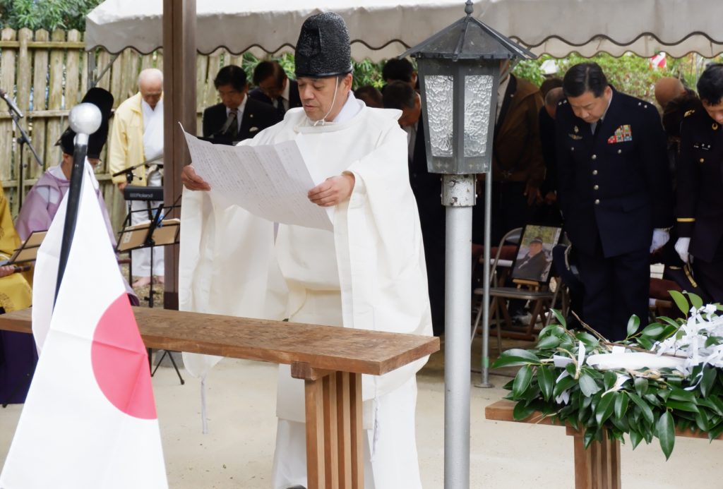 戦艦大和・第二艦隊戦没者追悼式で祝詞をささげる西口学宮司=天理市の大和神社