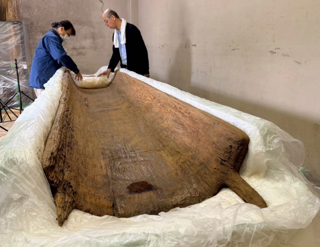 木の幹をくり抜いて蓋と身を組み合わせた割竹(わりたけ)形木棺で、端にある縄掛突起を除く長さは5・54㍍、最大幅69㌢。全体の7割ほどが残っており、木棺としては良好な保存状態となっている。ただ、腐食によるもろい部分もあり十分に保存処理することが必要という。