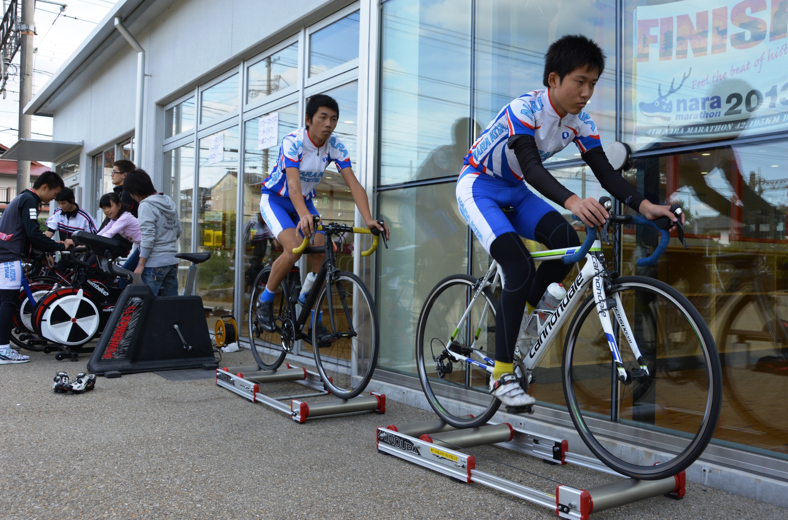 屋内トレーニングに使う電動の練習用自転車や、ローラー上での練習、競技用自転車の体験など自転車を楽しむさまざまなメニューを用意。県立奈良北高校と県立榛生昇陽高校自転車競技部の生徒らも参加し、自転車の魅力を紹介していた。