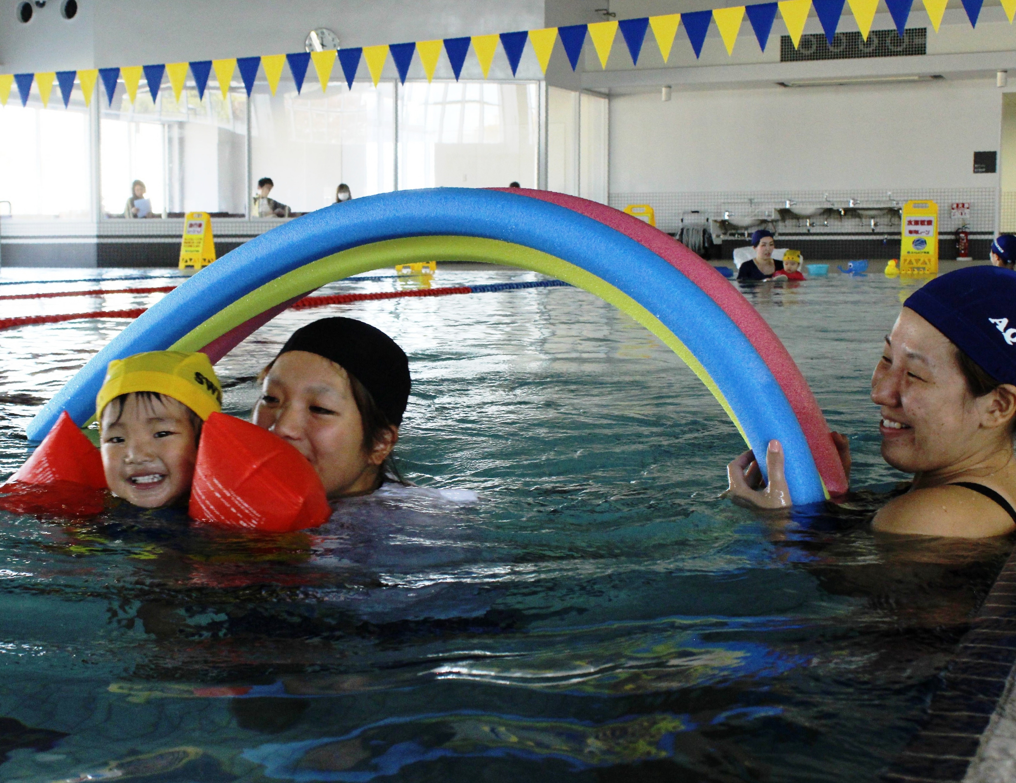 親子のふれあいと子供らに水に慣れてもらうのが狙い。プールは水温30・5度で、親子らは水中で体を動かす「アクアビクス」や、手作りのスポンジのおもちゃを水に浮かべるなどして楽しんだ。