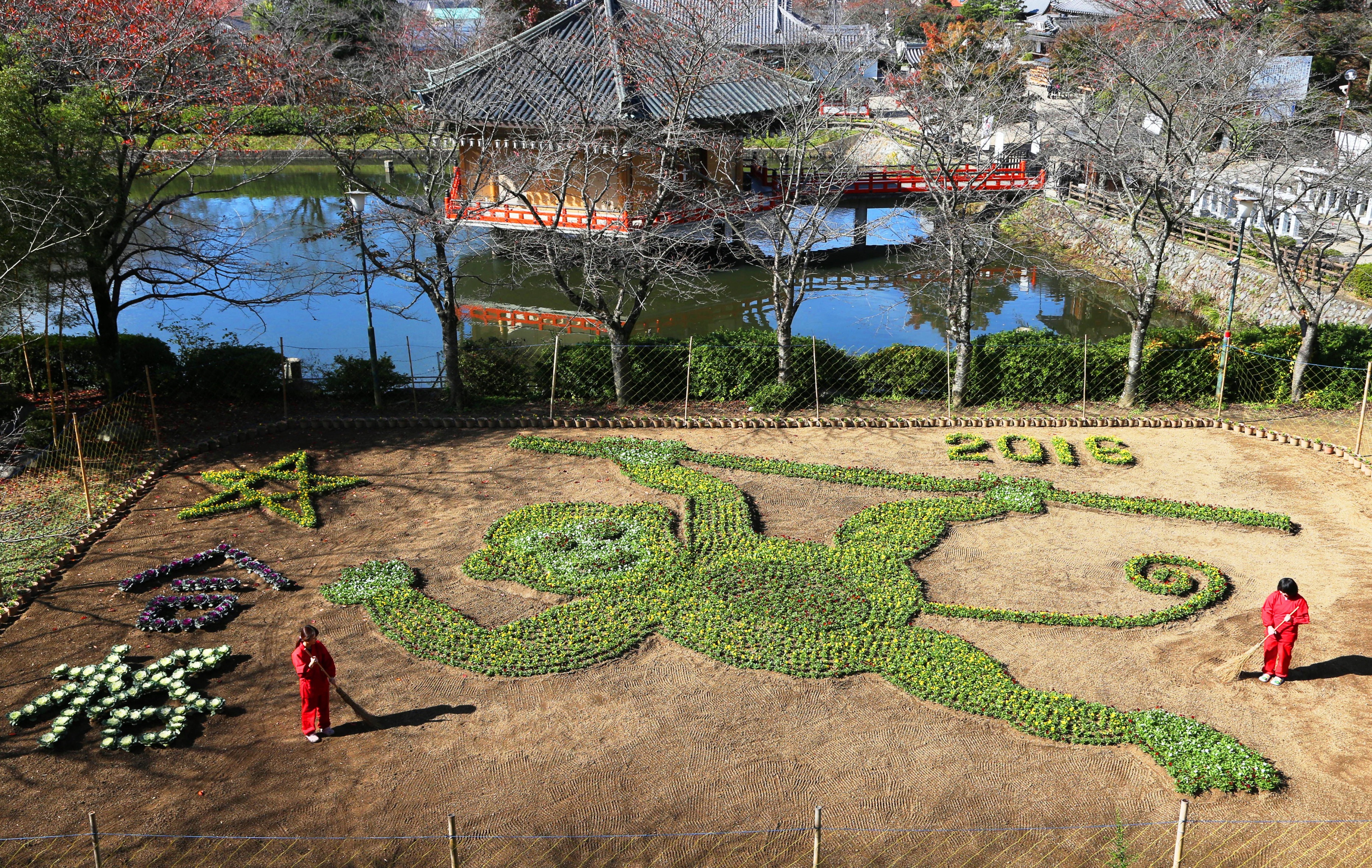 国内最大の文殊菩薩(国宝)がある桜井市の安倍文殊院に11日、約8千株のパンジーを使って来年の干支・申(猿)を描いたジャンボ花絵(縦20メートル、横25メートル)が登場した。