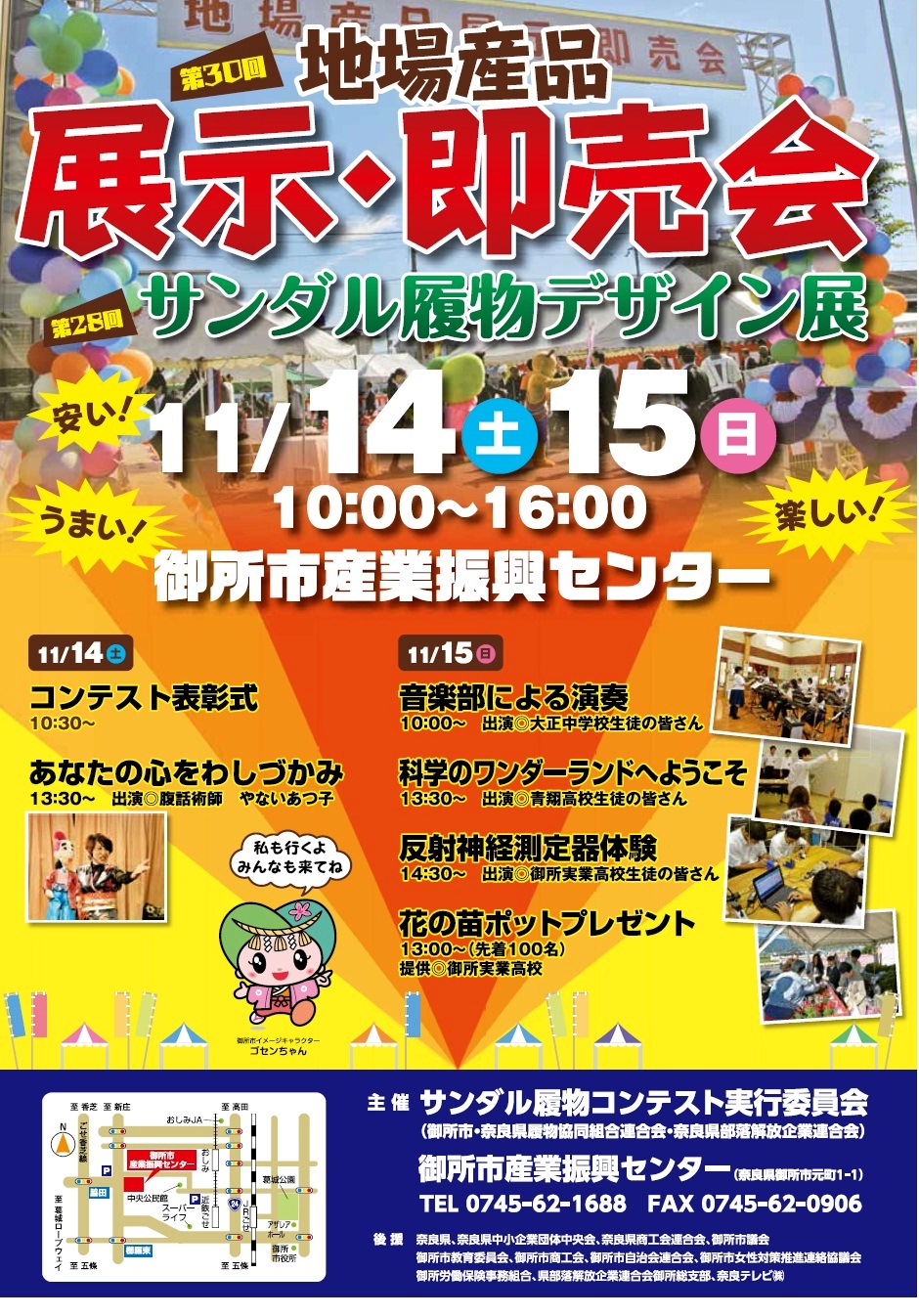 履物サンダルデザイン展も同時実施され、14日にはコンテストの表彰式や腹話術ショーが行われる。15日は大正中学校音楽部の公演や青翔高校の科学ショー、御所実業高校による反射神経測定器体験もある。