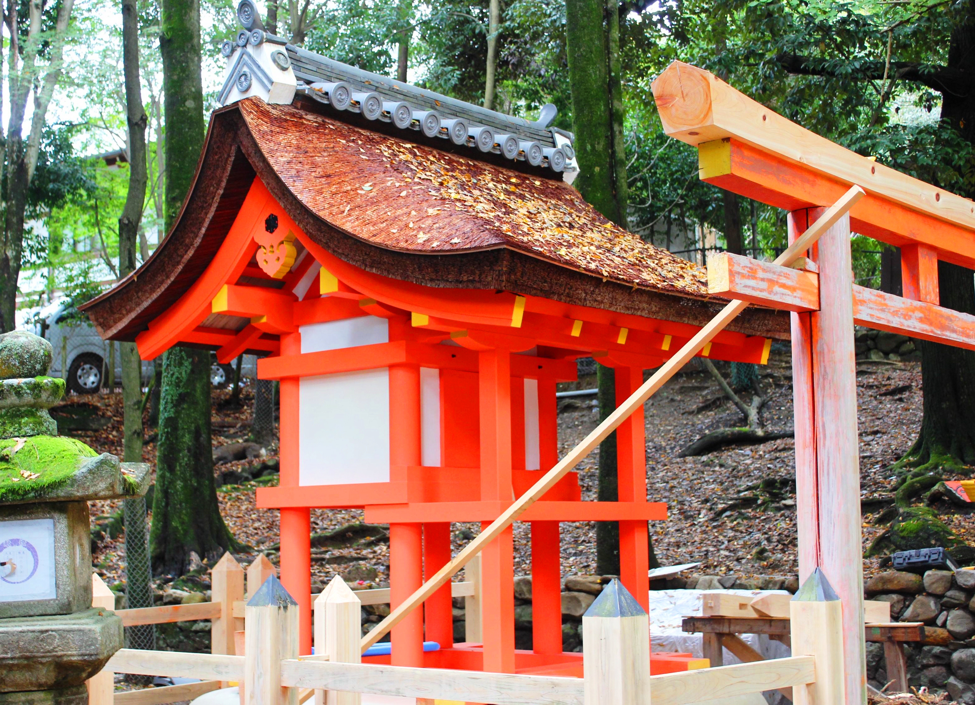 二之鳥居近くにある祓戸神社は勅使(天皇の使い)を迎えて行われる「春日祭」(3月13日)などの行事の際に身を清める重要な神社。今年8月の仮殿遷座祭でご神体が大社境内にある夫婦大国社の仮殿に移された後、20年ぶりに江戸時代末期に造られた社殿の修理が開始。檜皮屋根の葺き替えや柱の朱の塗り替えなどが行われてきた。