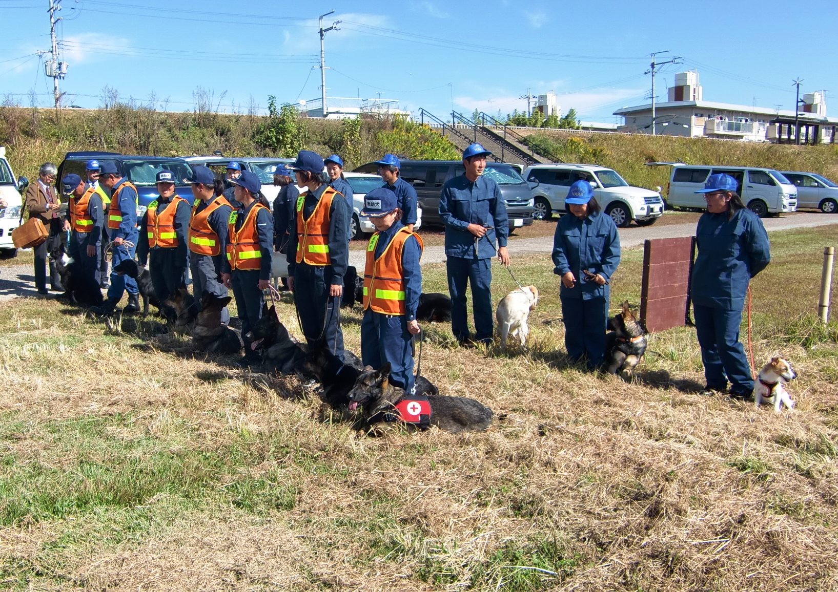 締結式に先立ち、吉野川河川敷で行われた展示訓練には、訓練士14人と救助犬など犬14頭が参加。服従訓練や捜索訓練などを披露した。