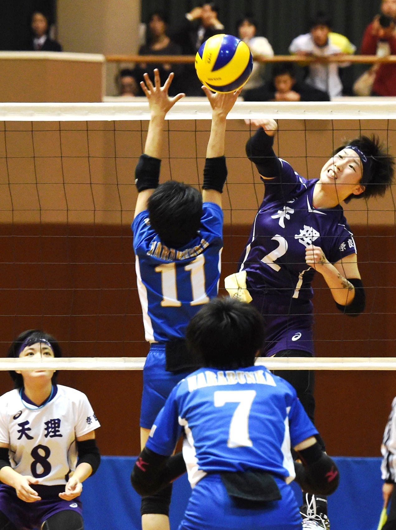 第5セットは序盤から激しい競り合い。天理は一時、3点を勝ち越すも、奈良文化が直後に5連続で得点し逆転。ここでタイムを入れた天理は八ツ橋孝江監督が「逃げたらいかん。攻めていこう」と鼓舞。落ち着きを取り戻した天理は岩根真由の連続スパイクなどで勝負を決めた。