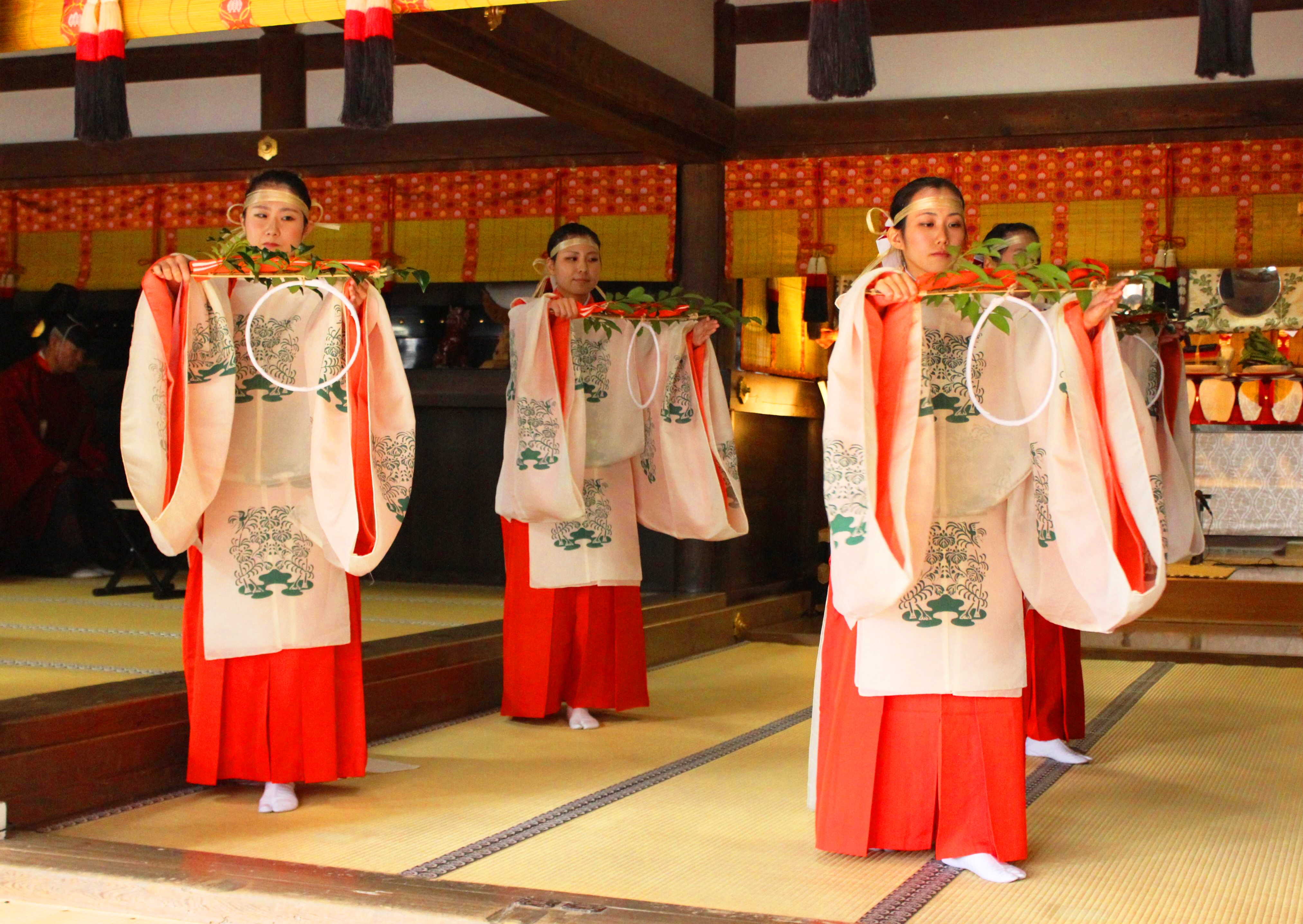 続いて4人の巫女が神楽「磯城の舞」を奉納。鏡に見立てた白い輪が付いた榊を手に、雅楽に合わせて優雅な舞を披露した。