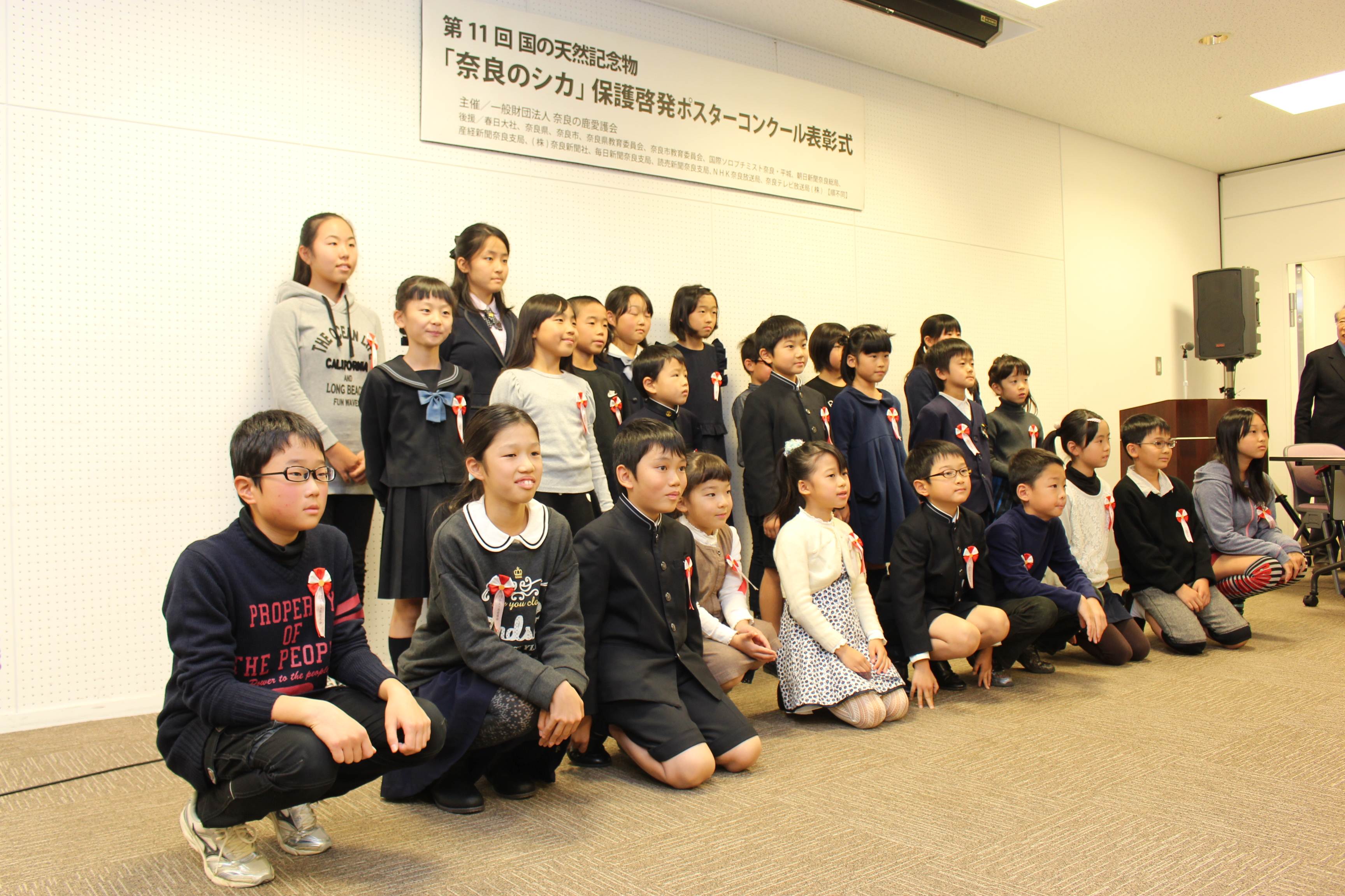 小学生を対象にした第11回「奈良のシカ」保護啓発ポスターコンクール(奈良の鹿愛護会主催)の表彰式が28日、奈良市の県立図書情報館であり、入賞した29人に賞状と記念品が贈られた。入賞作品は12月13日まで同館エントランスホールで展示される。