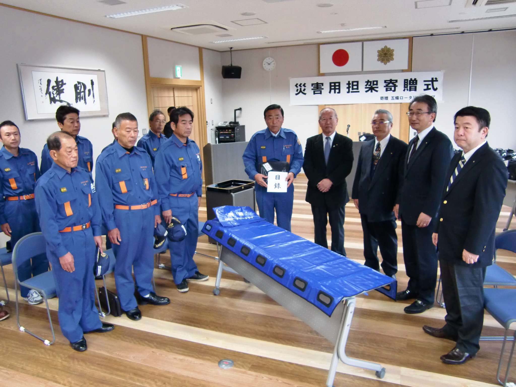 紀伊半島豪雨災害などの災害救助の際、従来の担架では急斜面や狭い場所で使いにくいとの意見があったことから、折りたたんで持ち運びができるテント生地の担架を寄贈。式には五條RCの小竹祥善会長らと同市消防団の櫻井利文団長らが出席し、小竹会長は「万が一の災害の場合は、市民の安全の確保に活用していただきたい」とあいさつした。