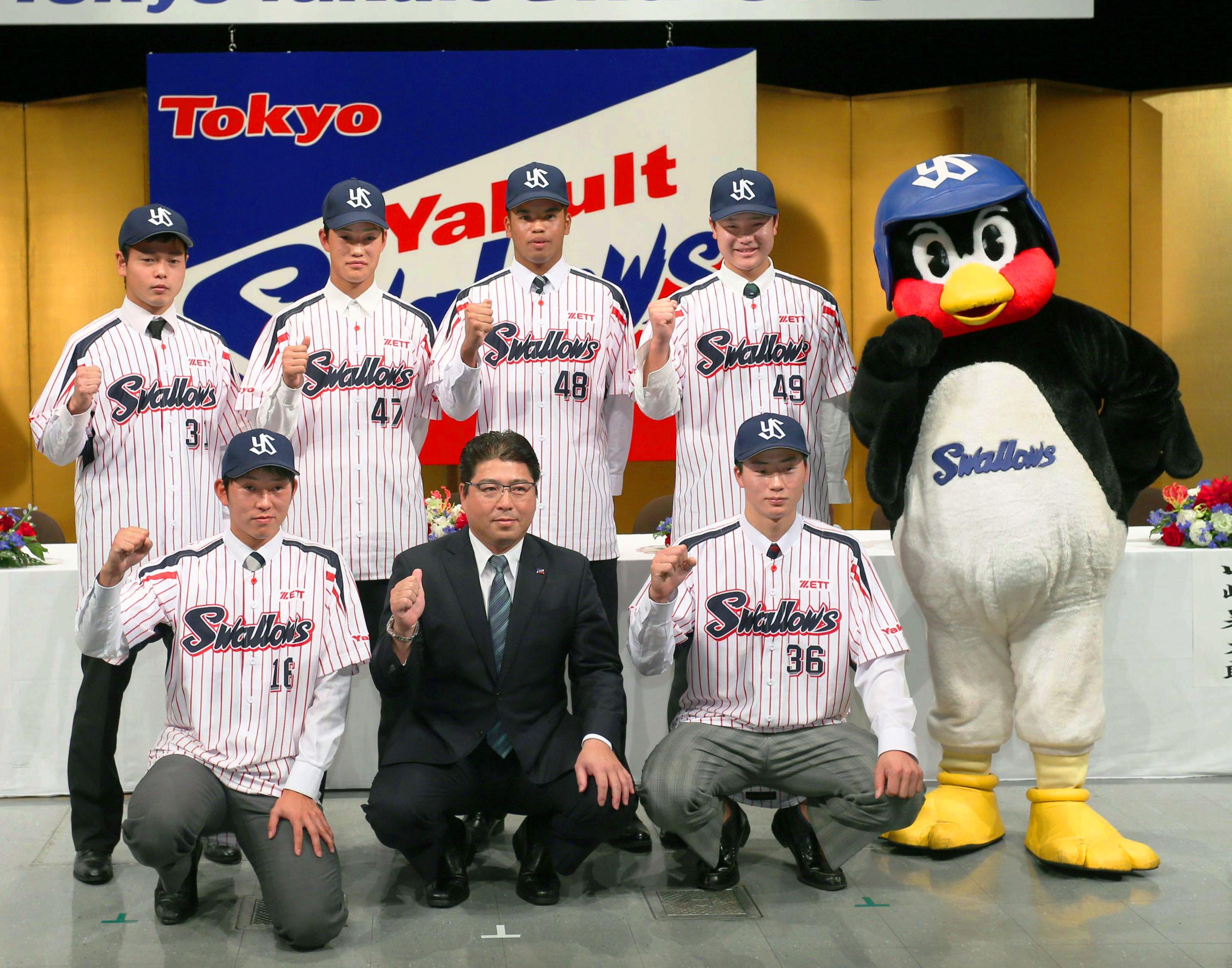ドラフト1位 原樹理投手(22)=東洋大、背番号16▽2位 広岡大志内野手(18)=智弁学園高、背番号36▽3位 高橋奎二投手(18)=京都・龍谷大平安高、背番号47▽4位 日隈ジュリアス投手(18)=高知中央高、背番号48▽5位 山崎晃大朗外野手(22)=日大、背番号31▽6位 渡辺大樹内野手(18)=千葉・専大松戸高、背番号49