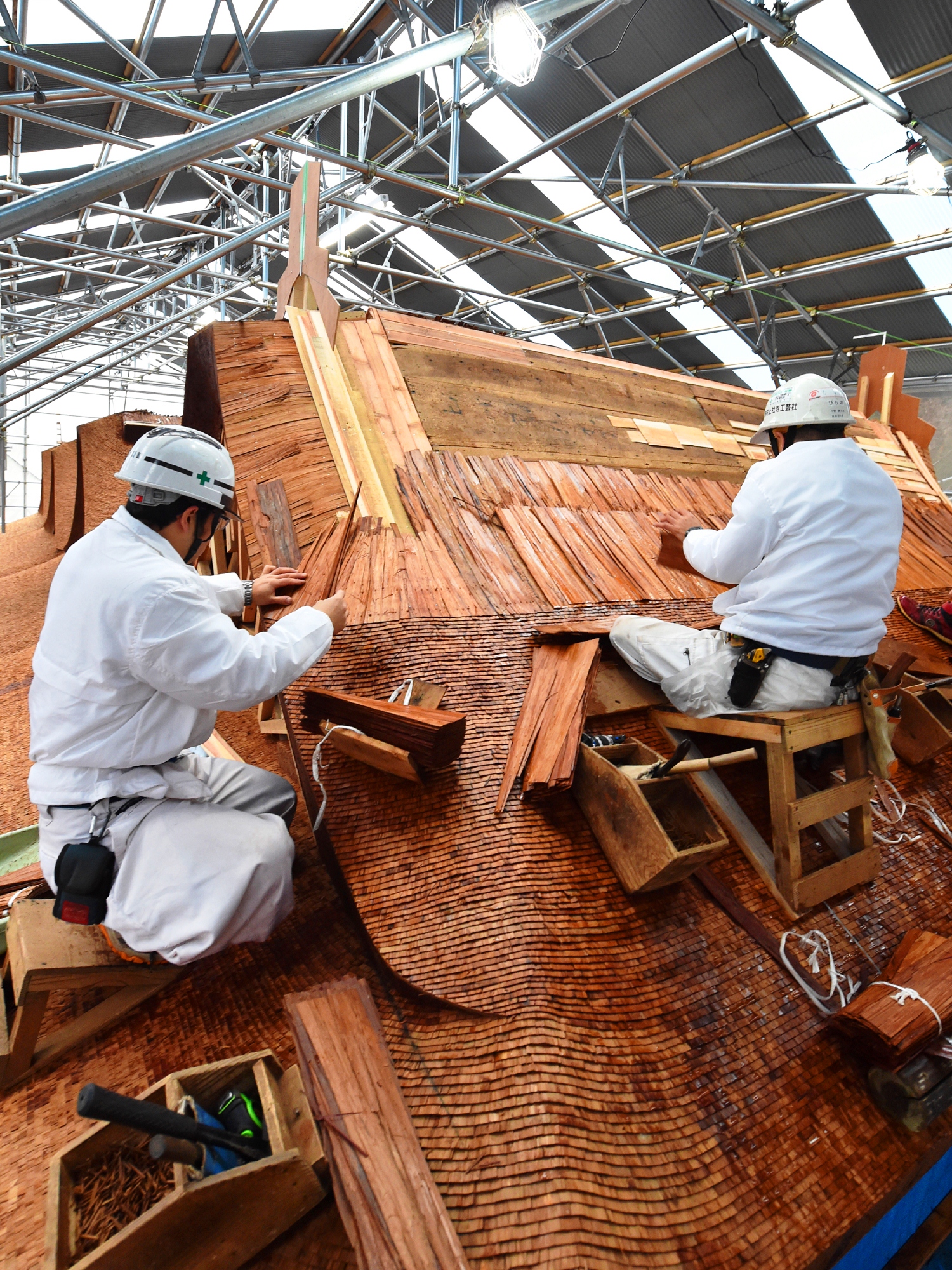 年内にすべての葺き替えを終える予定で、その後は柱の朱の塗り替えなどを行う。ご神体は現在、西隣の御仮殿に移されており、来年11月6日の「本殿遷座祭」で戻される。