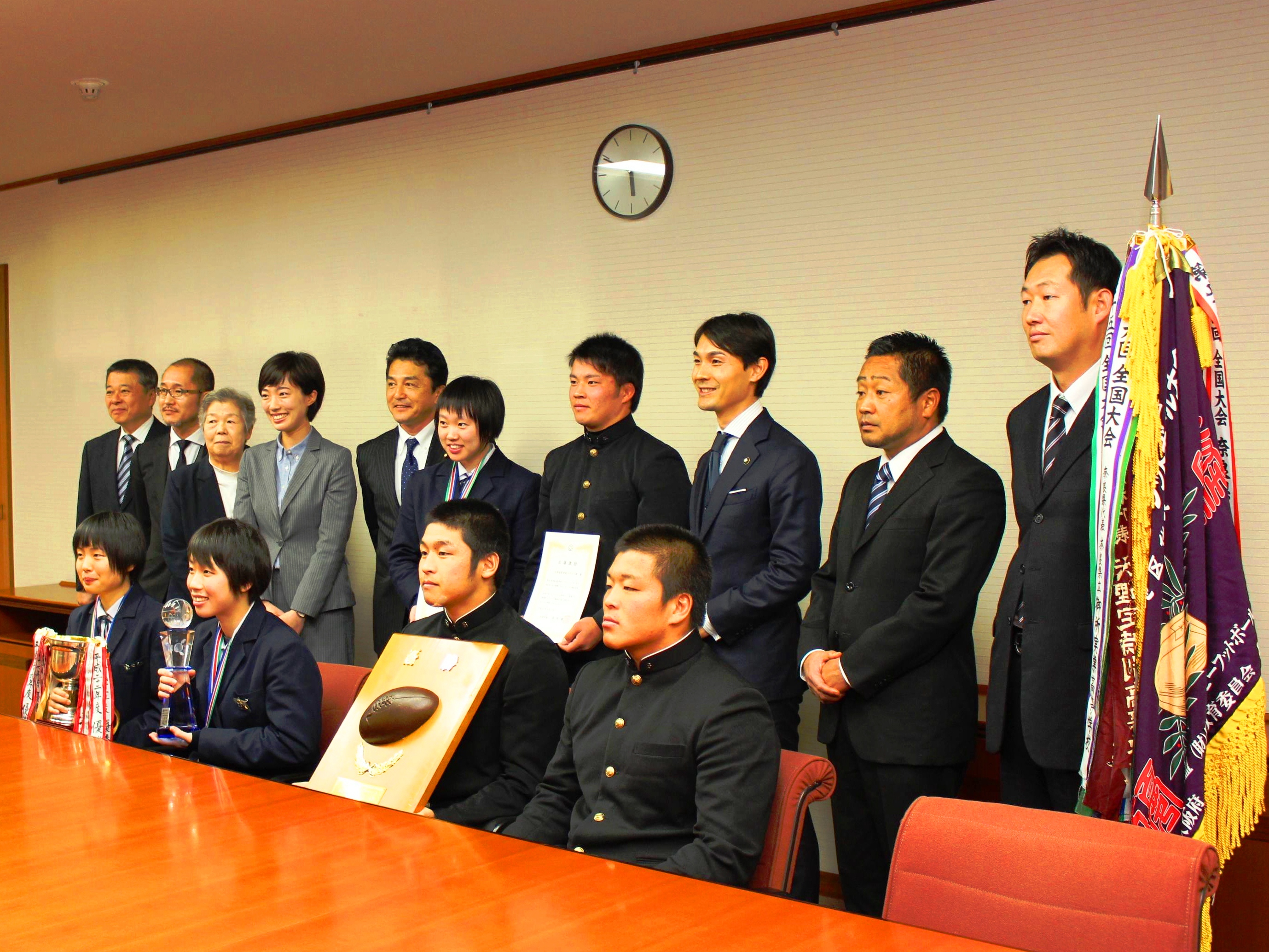 天理市役所を表敬訪問した天理高校ラグビー部と女子バレーボール部の選手ら