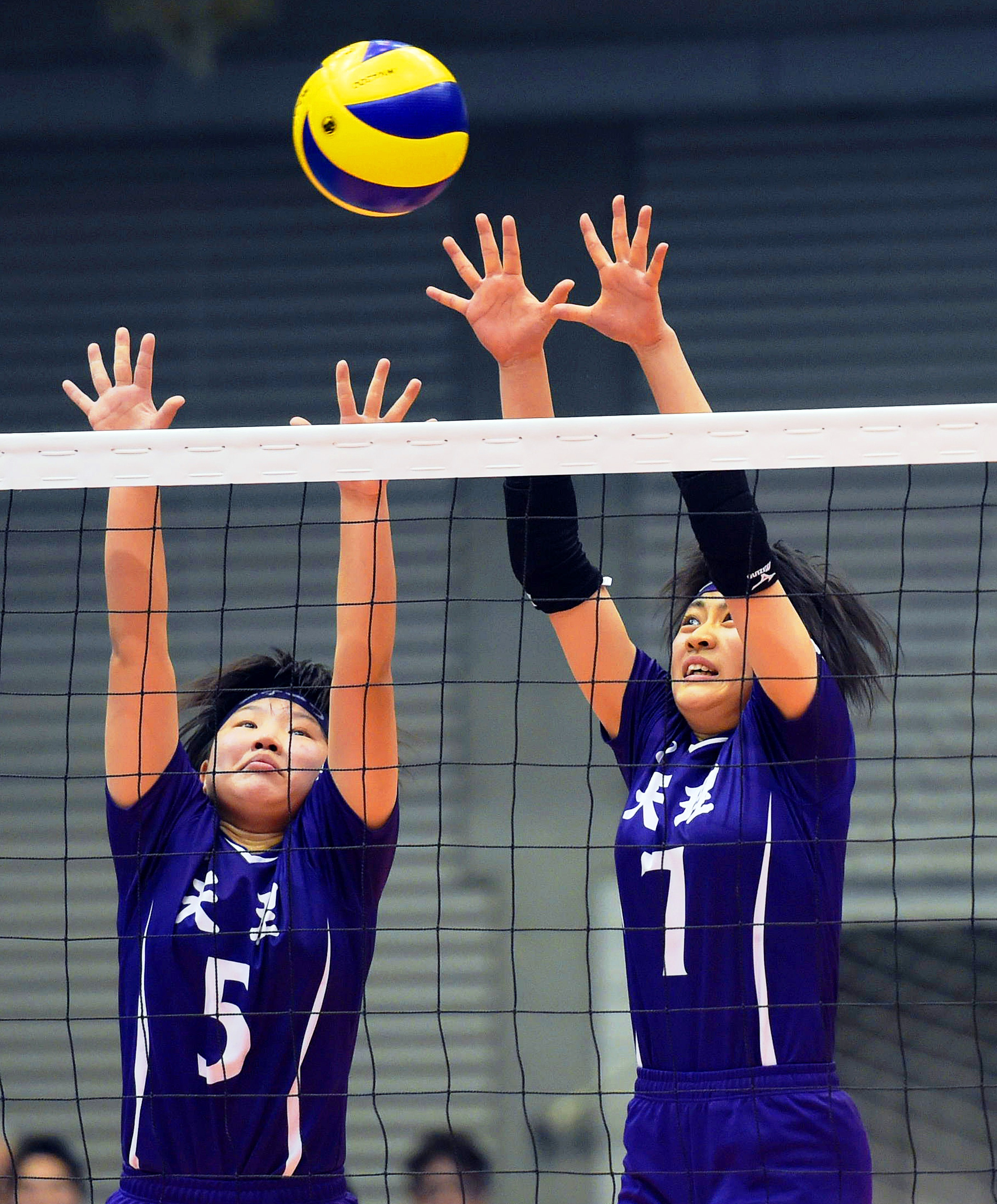 【天理-大社】第1セット、ブロックに跳ぶ、天理・口塚ゆき(左)と末代由芽(右)