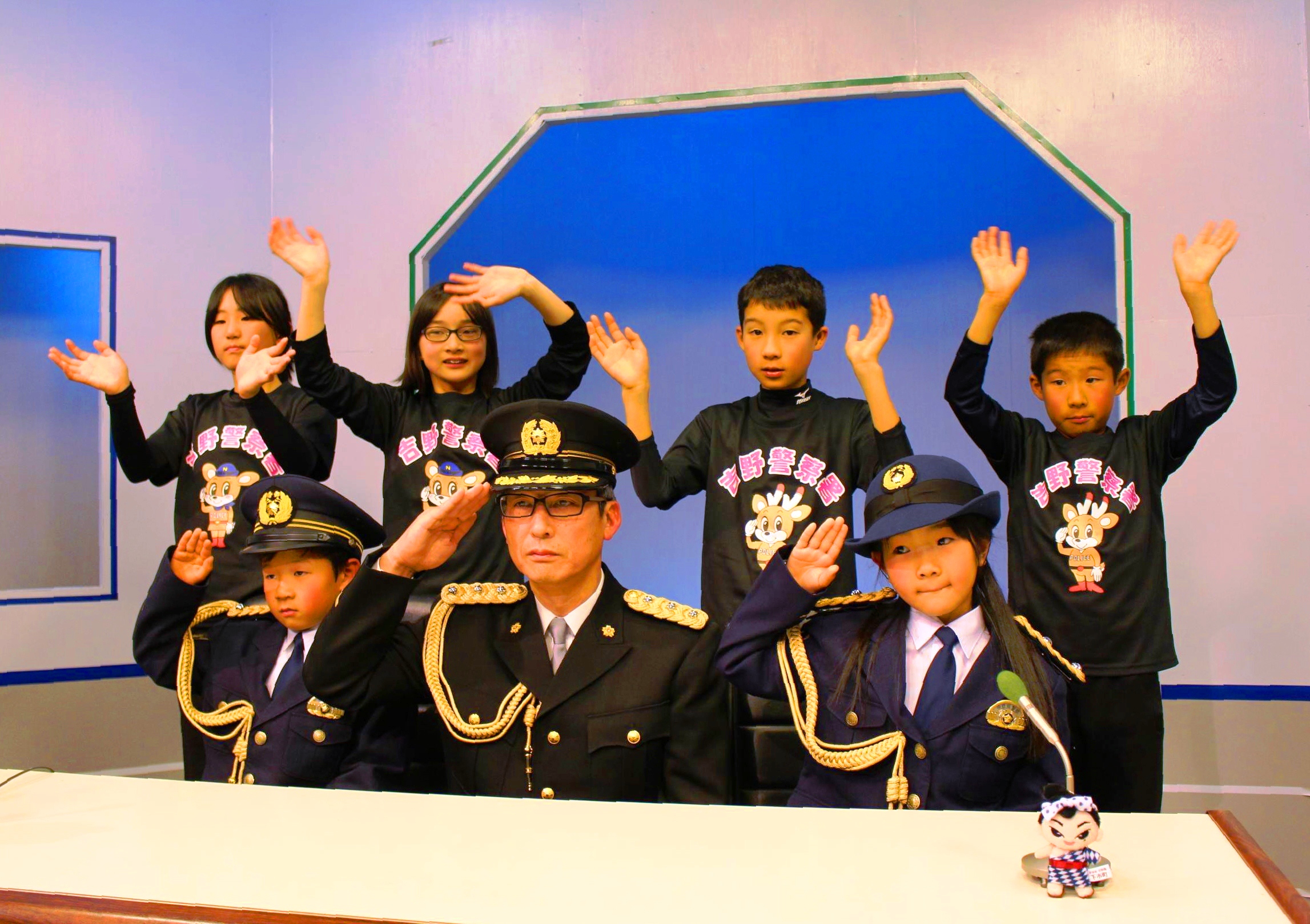 地域住民に災害時のボランティア活動や自主防災への理解を深めてもらおうと企画。収録に当たり、下市町立下市幼稚園の桝井怜愛さん(6)と大淀町立大淀東部幼稚園の松田航くん(6)の2人を1日警察官の「キッズポリス」に任命した。