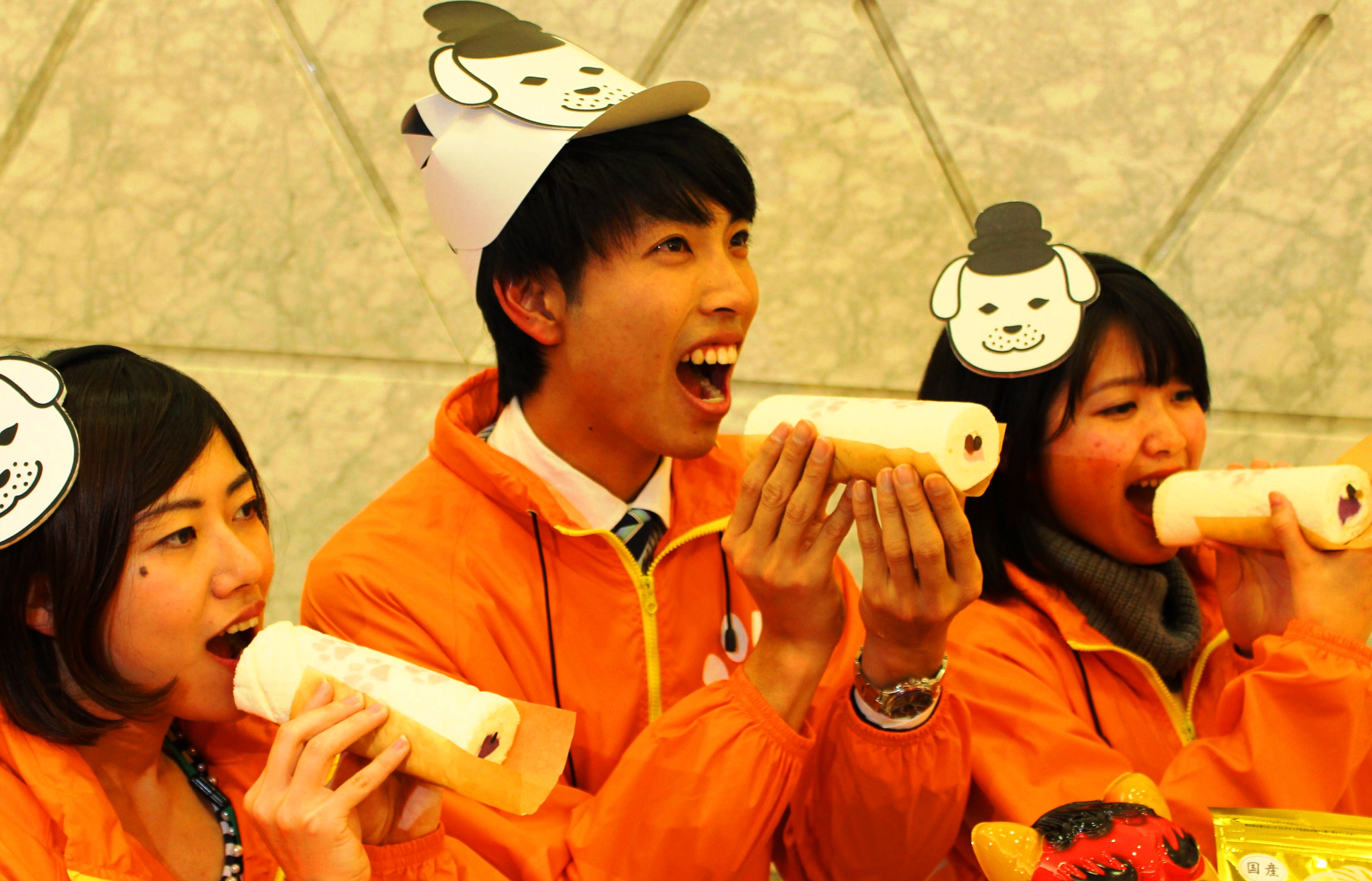 今回新たに登場した「恵方ゆきろ~る」は直径5センチ、長さ16センチで、1人で丸かぶりできる大きさ。雪丸の足跡を装飾した白いスポンジに紫芋、きなこ、チョコレート、イチゴの4色のクリームを包み、5色の甘い豆をトッピングしている。hinataの出井行人オーナー(45)は「果汁分の多いクリームと豆の相性がよく、すしの恵方巻にも負けない食べ応えがある。節分に家族そろって楽しんでほしい」と話している。