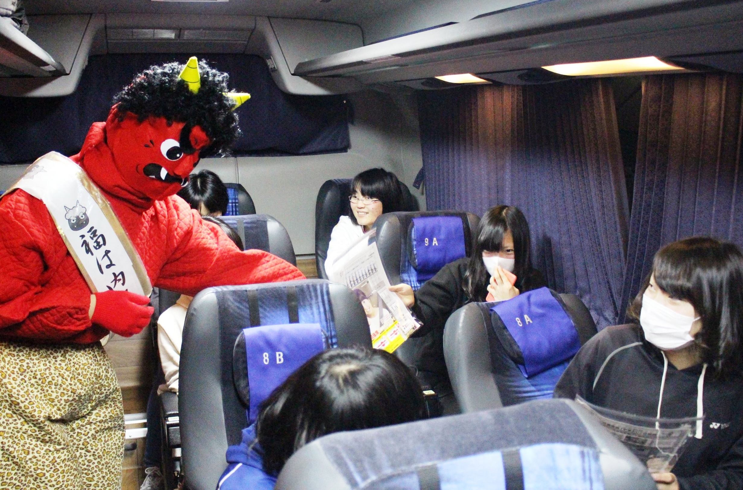 節分にちなみ、署員が「福は内、事故はなし」と書いたたすきを掛けた「赤鬼」にふんして登場。近鉄奈良駅前から関東へ向かう高速バス車内で、利用客約30人のシートベルト着用を確認しながら、福豆や啓発グッズを配った。