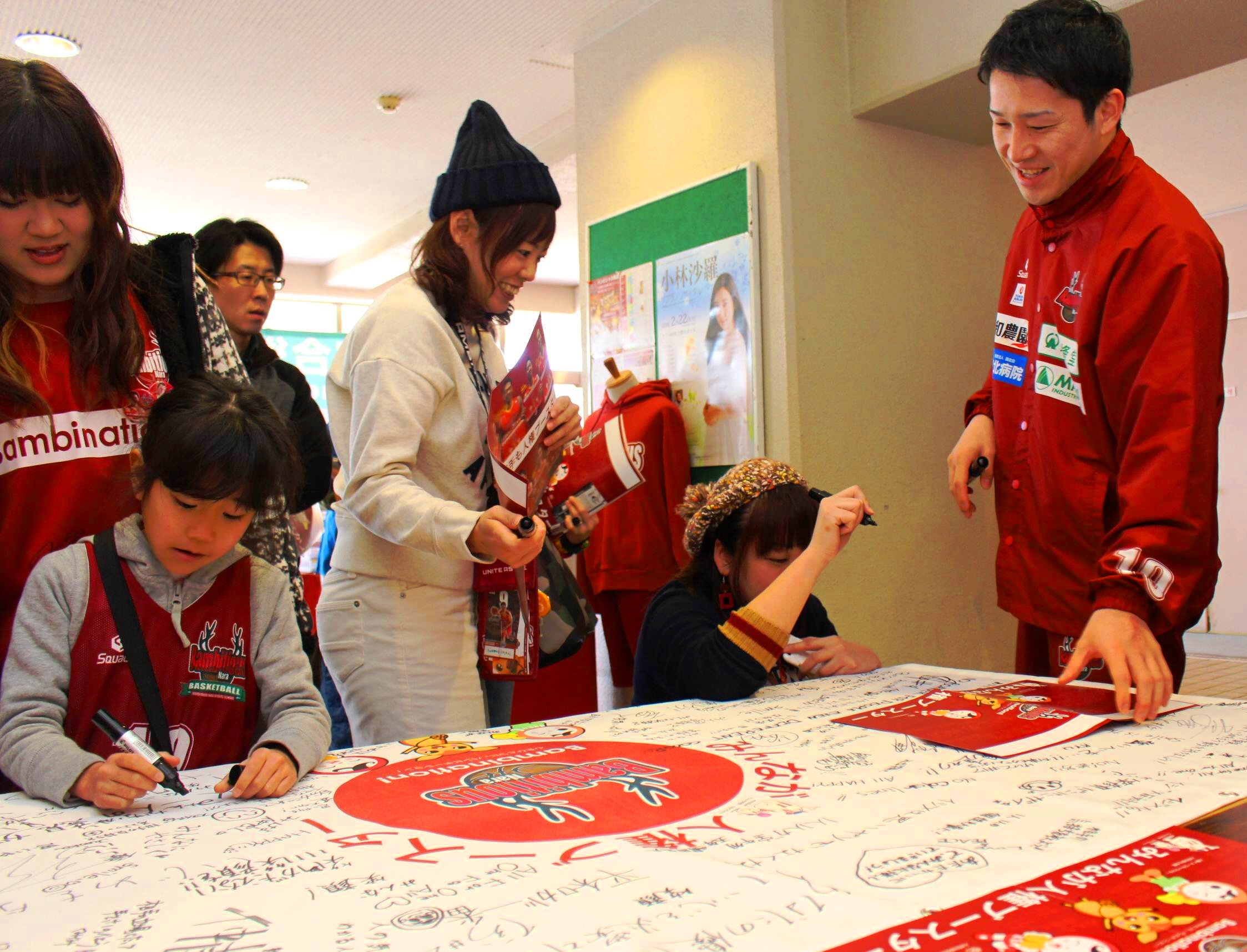プロバスケットボールTKbjリーグ「バンビシャス奈良」は、滋賀レイクスターズ(滋賀県)とのホームゲームに臨んだ奈良市中央体育館で「みんなが人権ブースター!」を合言葉にした人権啓発活動を展開。選手も観客とともにメッセージを書き込んだ。