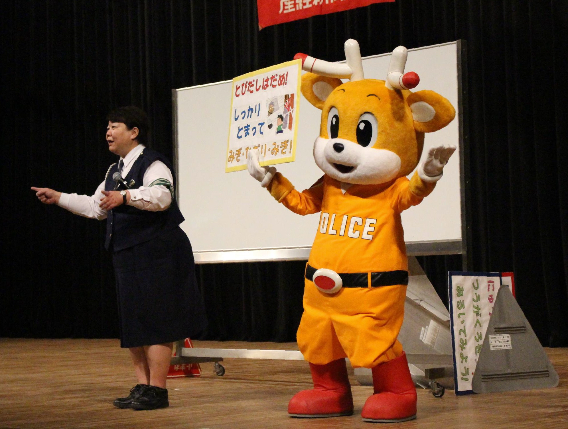 続いて県警交通企画課の威徳理香子巡査部長が横断歩道の渡り方や道路標識について県警のマスコットキャラクター「ナポくん」と説明。「道路を渡るときは左右の確認をして。入学前にお父さん、お母さんと通学路を歩いてみてください」と呼び掛けた。