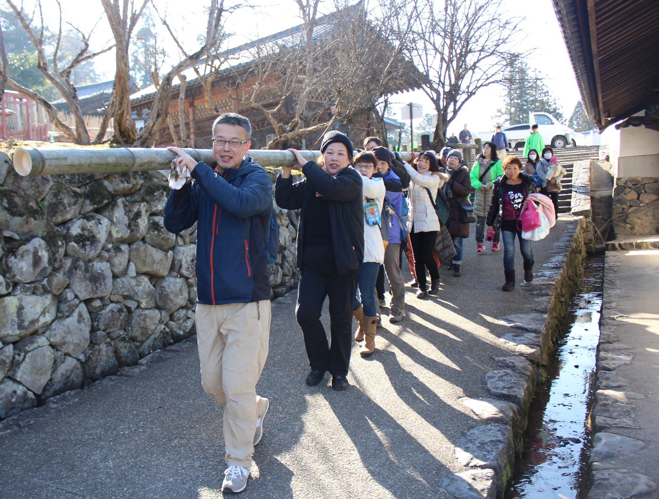 有志でつくる「仁伸会」のメンバーや市民ら約50人が参加。1月に同市東鳴川町の竹林で全長約8メートルの竹を伐採し、境内の鐘楼前までトラックで運搬。約200メートル離れた二月堂まで担いで運んだ。