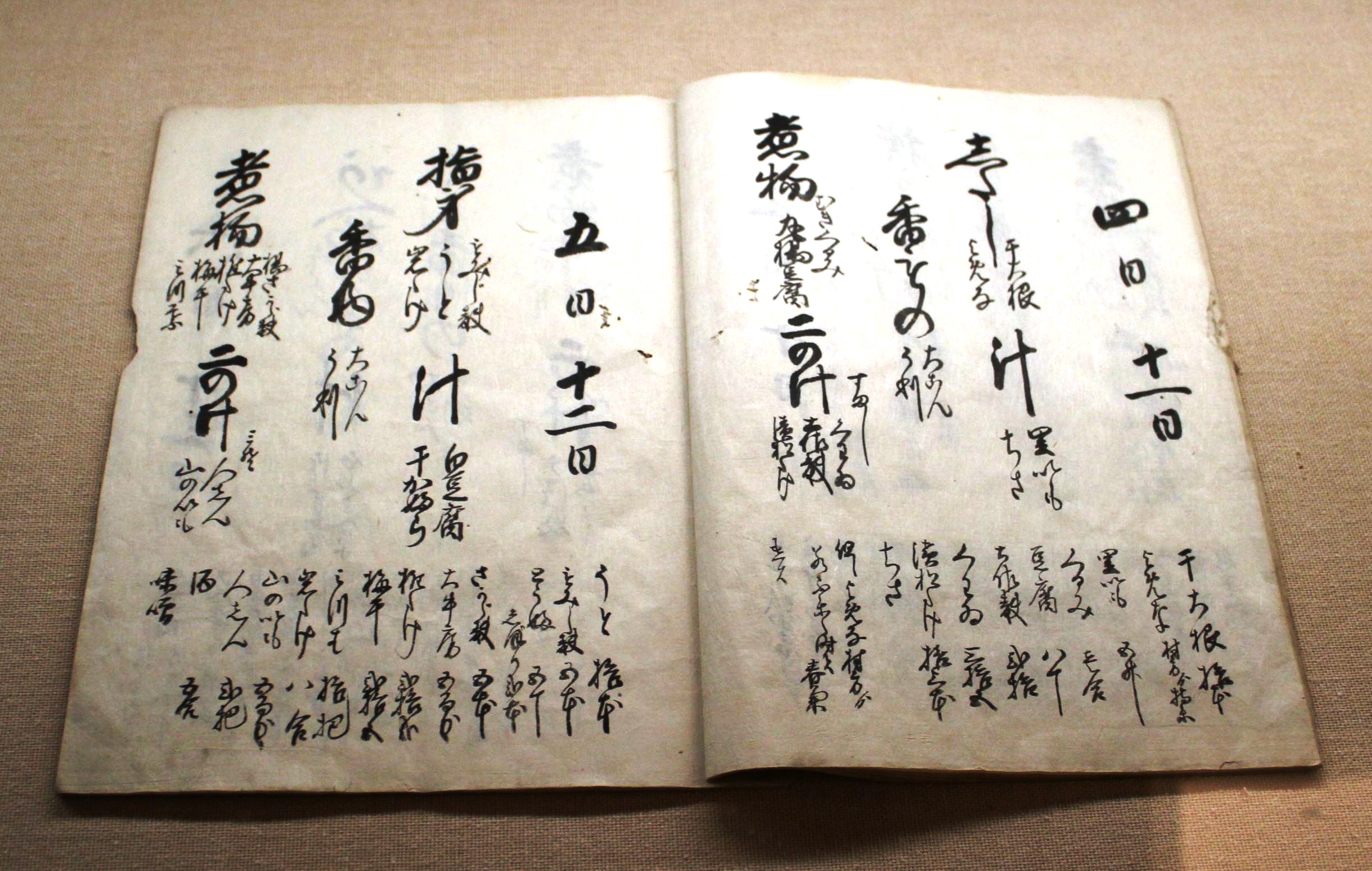 練行衆が各地の神々を勧請するため読む「二月堂神名帳」(重文、室町時代)など、祈りの様子が分かる文書も。「二月堂修中献立控」(同、江戸時代)は練行衆の食事の献立で、もみじ麩・ウド・岩茸の指身(刺し身)といったメーンのおかずも記されている。