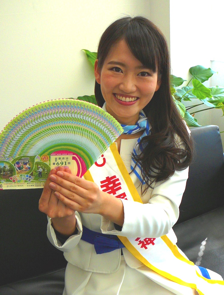 1等と前後賞の賞金総額が6億円の「グリーンジャンボ宝くじ」PRのため、宝くじ「幸運の女神」の増林千晶さん(26)が3日、産経新聞奈良支局を訪問した。