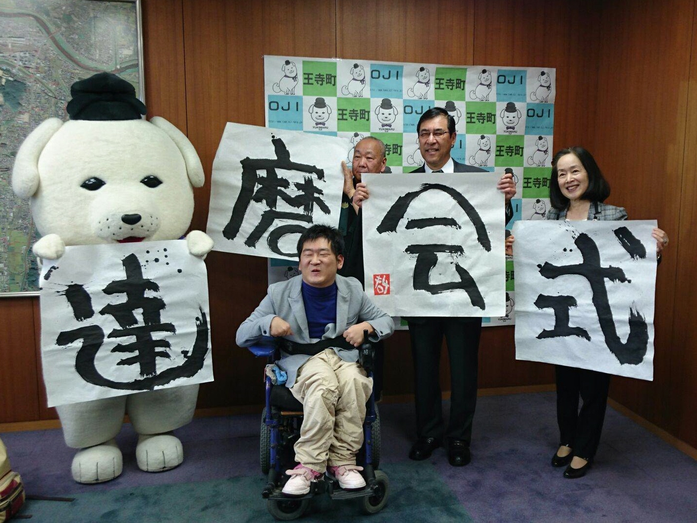 町役場で行われた贈呈式では、高岡さんが70センチ四方の和紙4枚に書いた作品を平井康之町長に贈呈。養護学校教諭だった15年前から高岡さんに書道を教えている明珍さつきさん(67)も同席し、高岡さんが唯一動く左手で字を書いていることなどを説明、「『達』の字のしんにょうに、はらいが得意な哲也さんらしさが表れています」と話した。平井町長は「今後達磨会式に限らず、町のさまざまな行事で協力していただきたい」と述べた。