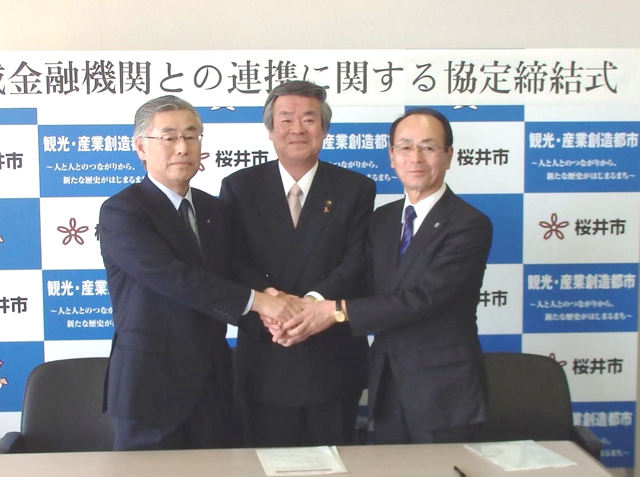 締結式では松井正剛市長、橋本隆史・南都銀行頭取、郡山尚・大和信金理事長がそれぞれ協定書に署名。橋本頭取は「地域金融機関として、昨年設立した『奈良県観光活性化ファンド』(10億円)なども活用しながら支援を行っていきたい」とし、郡山理事長は「桜井市生まれの金融機関として、われわれが持つ資源、知見、ノウハウをいかして市の発展に尽くしたい」とコメント。松井市長は「これまで以上に情報共有をはかり、連携を強化してまちづくりをはかっていきたい」と話した。