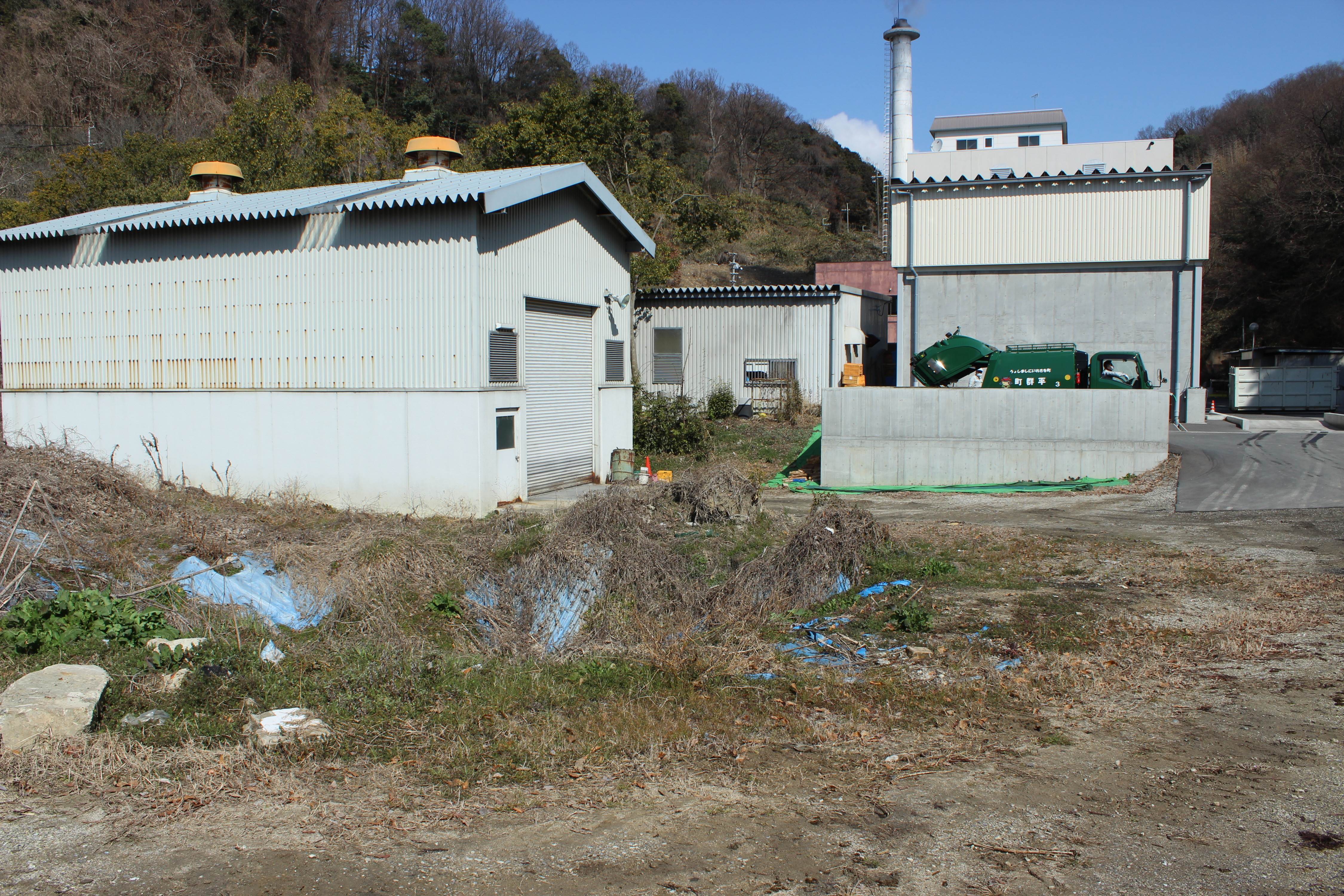 清掃センターの敷地内に仮置きされている焼却灰(手前部分)