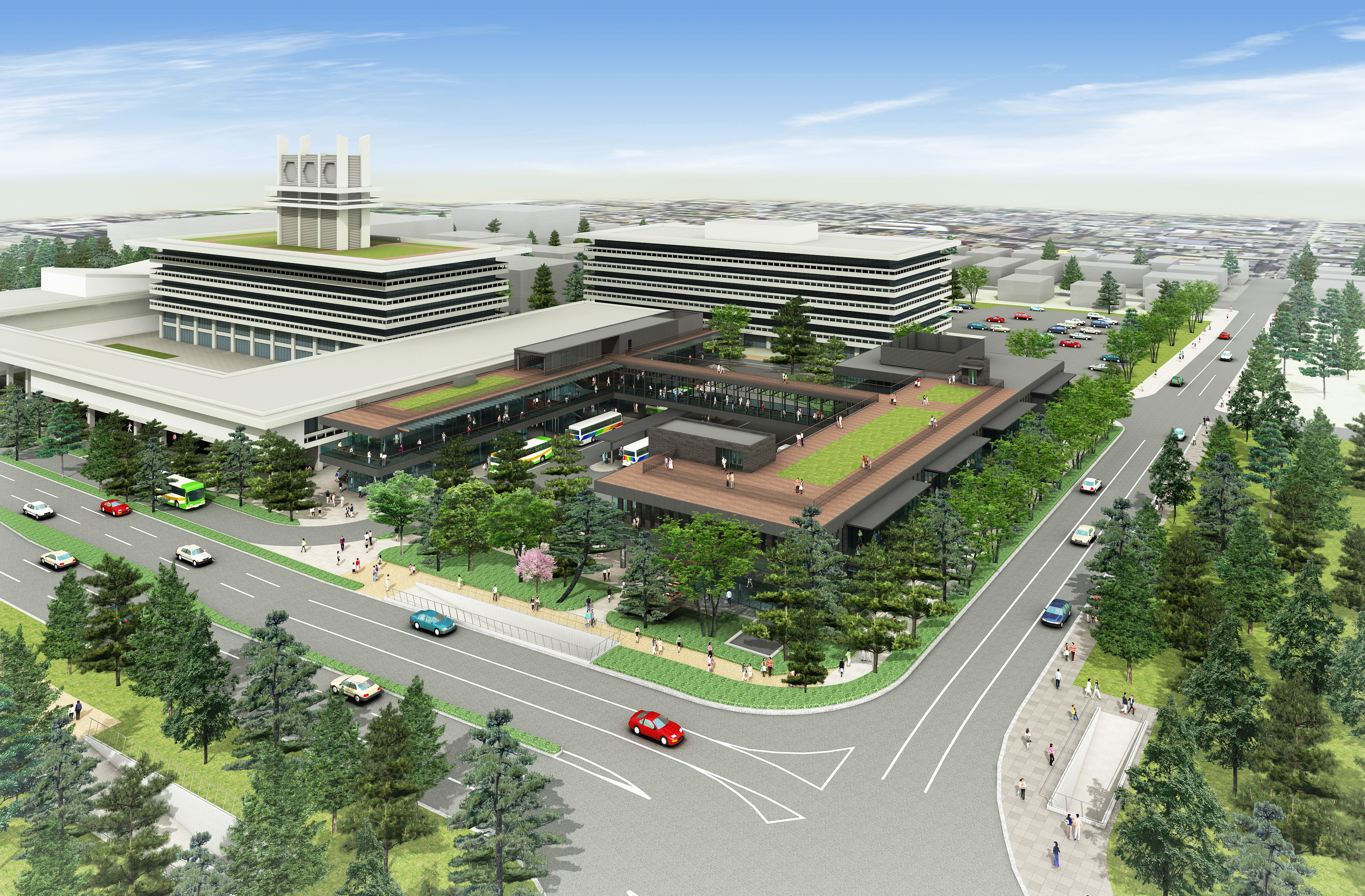 施設の屋上は眺望が楽しめるよう芝生化。周辺には緑地帯を作ってクロマツを植えたり、現在あるナラノヤエザクラを保全するなどし、周囲景観にも配慮する。