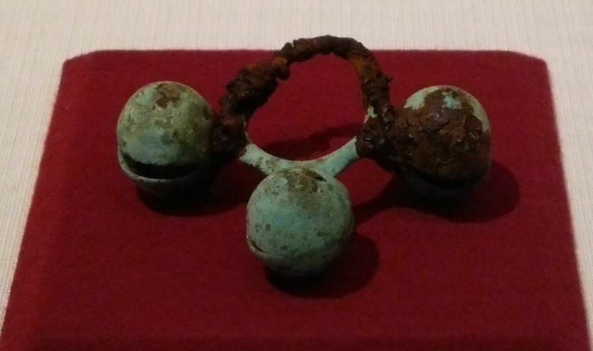 このうち、下北方古墳群にある下北方地下式横穴5号墳の遺物では、金製垂飾付耳飾や鏡、鉄剣、短甲、冑、馬具を構成する鈴「三環鈴」など豊富な副葬品の一部を展示。この古墳は、地下に横穴を掘った南九州独特の「地下式横穴墓」と呼ばれるタイプで、多くの副葬品が見つかっていることから首長の墓とみられている。会場では展示品の三環鈴の音を録音で聞くこともできる。
