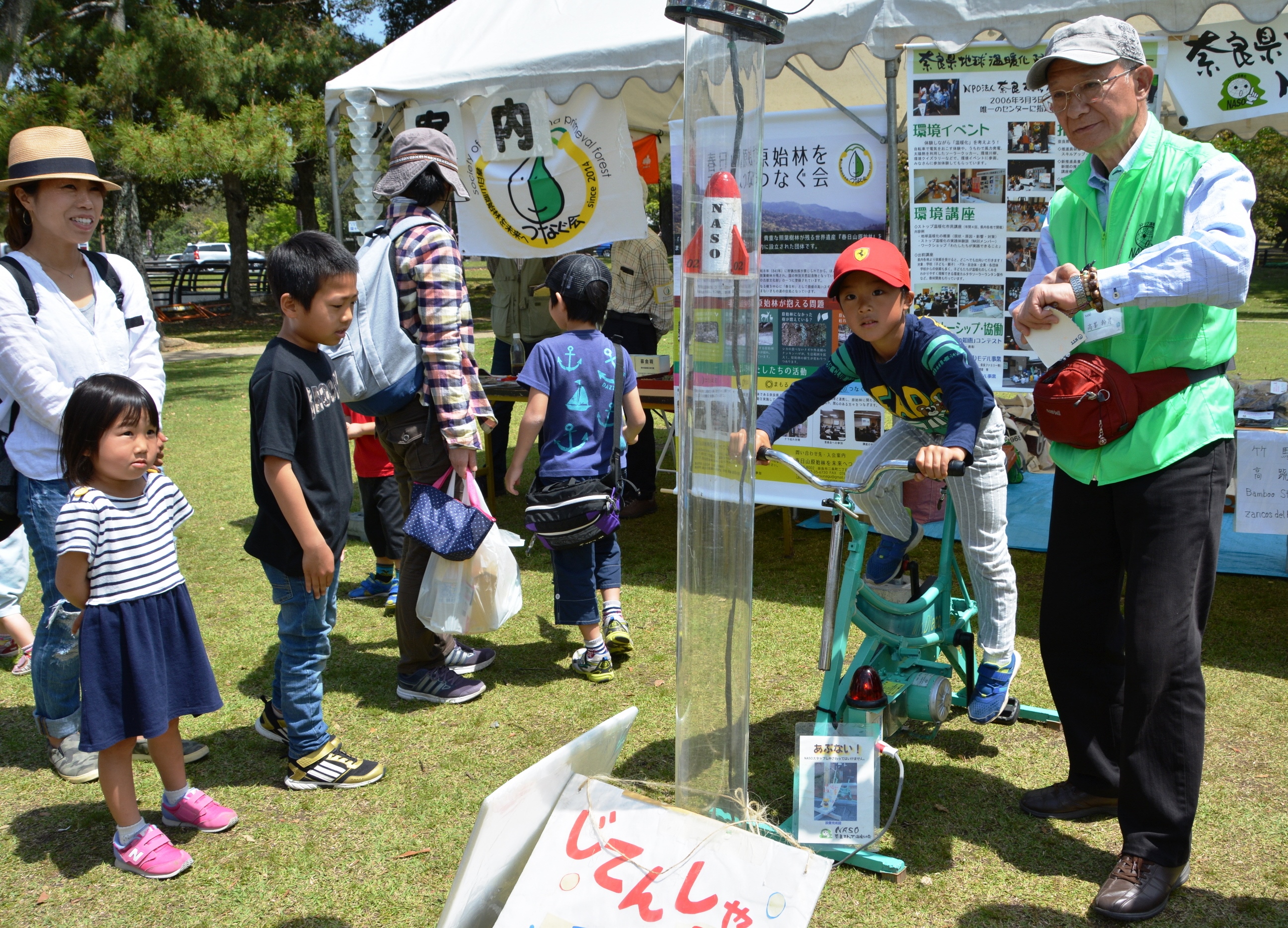 県内を中心に飲食店や学生、環境関連のNPO法人などが、自転車発電の体験や無農薬野菜の販売など75のブースを開設。解説を受けながら世界遺産・春日山原始林を歩いたり、鹿苑でシカの現状を学ぶ体験も行われた。