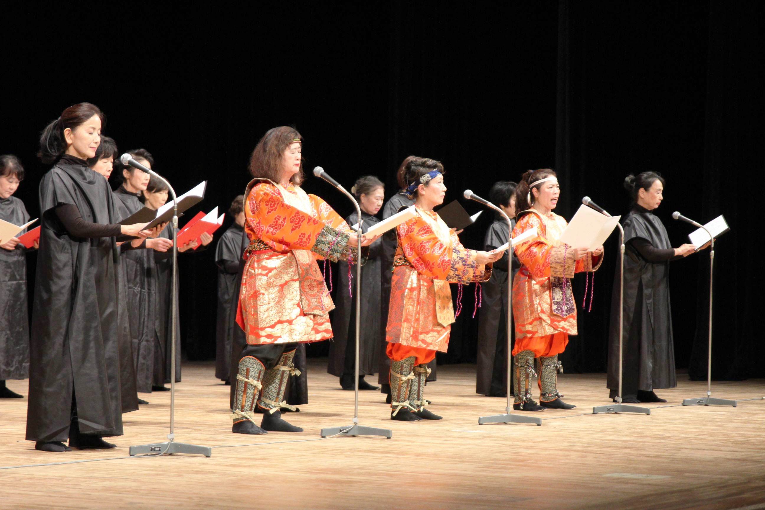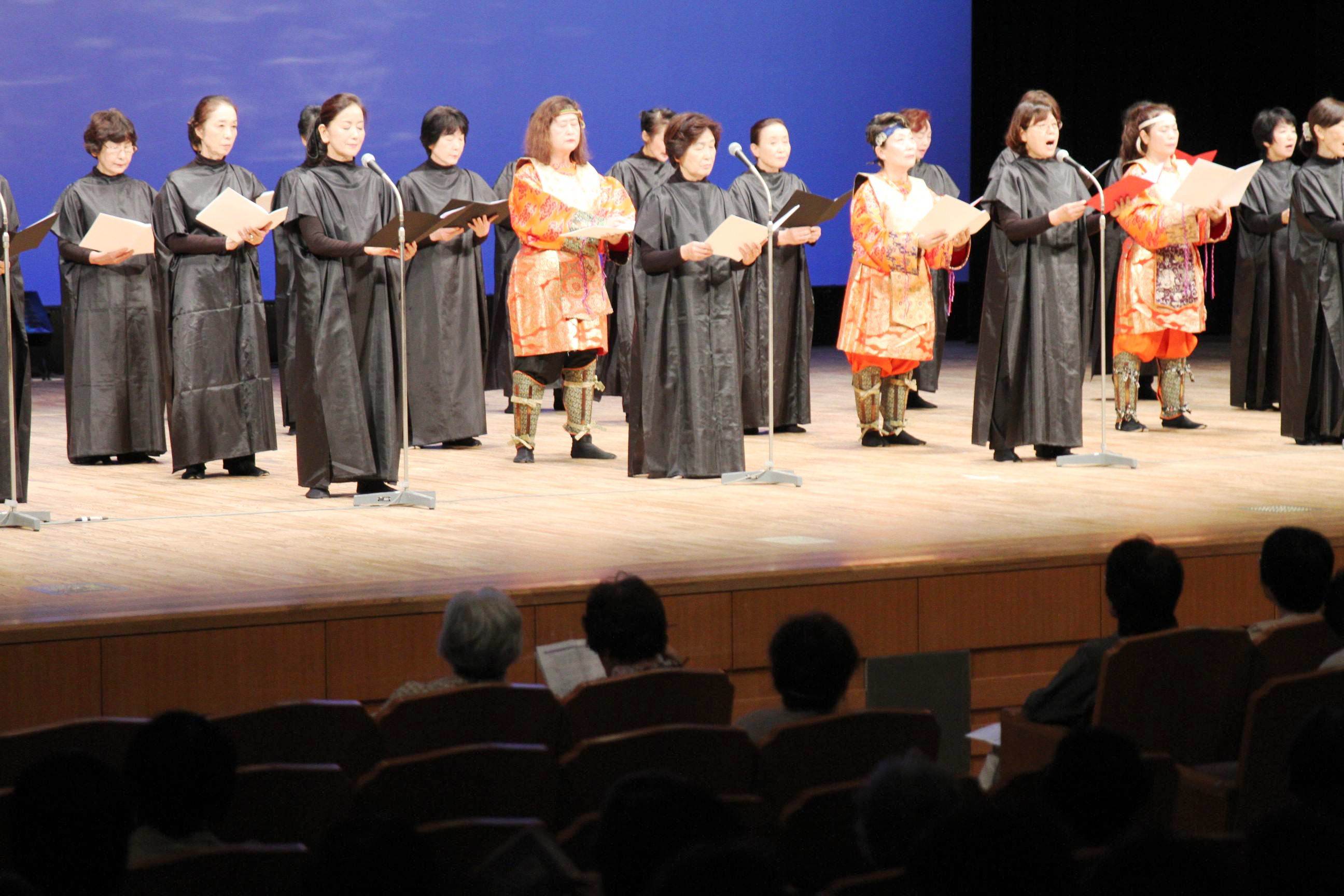 9月12日に開かれたつどいの第1部では、県内で朗読を学ぶ「泉のたまご」など4グループが芥川龍之介の『蜘蛛(くも)の糸』などを朗読。第2部では、泉の会の50人による那須与一の群読や遣唐使物語の朗読が行われ、会場からは惜しみない拍手が送られた。