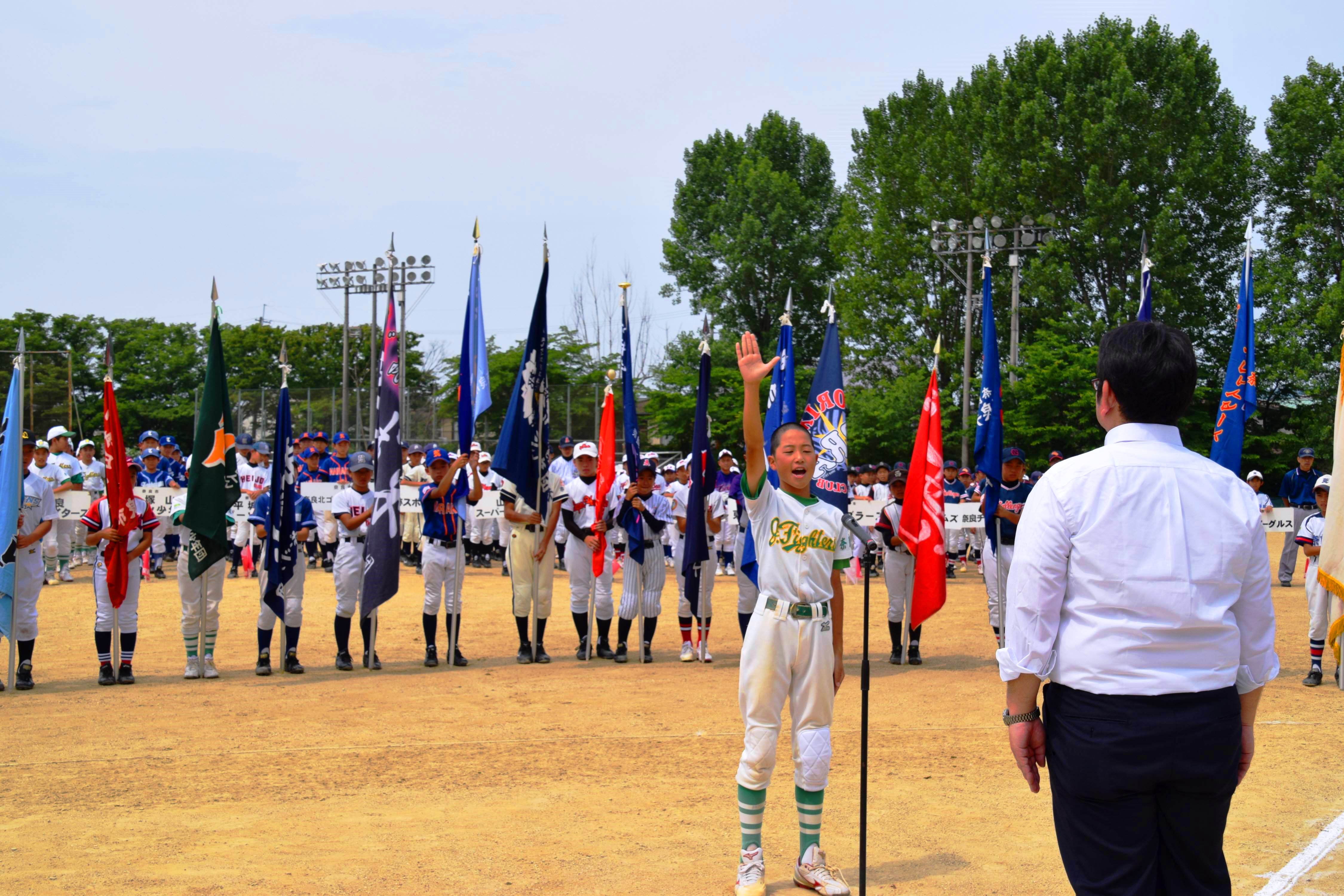 奈良ジュニアファイターズの6年、川村拓也主将が「家族やコーチに感謝の気持ちを忘れず、最高の仲間と全力でプレーすることを誓います」と力強く選手宣誓。この日は1回戦6試合が行われ、選手たちが熱戦を繰り広げた。