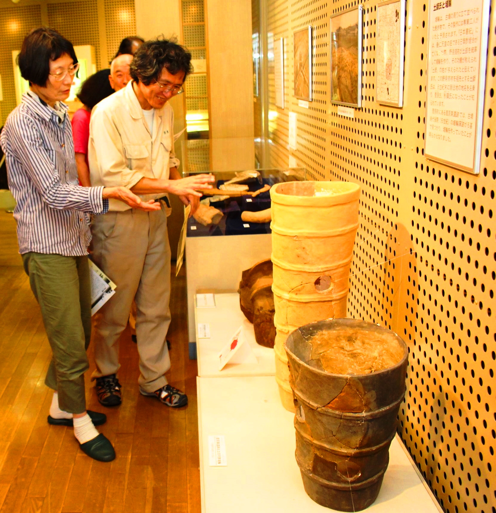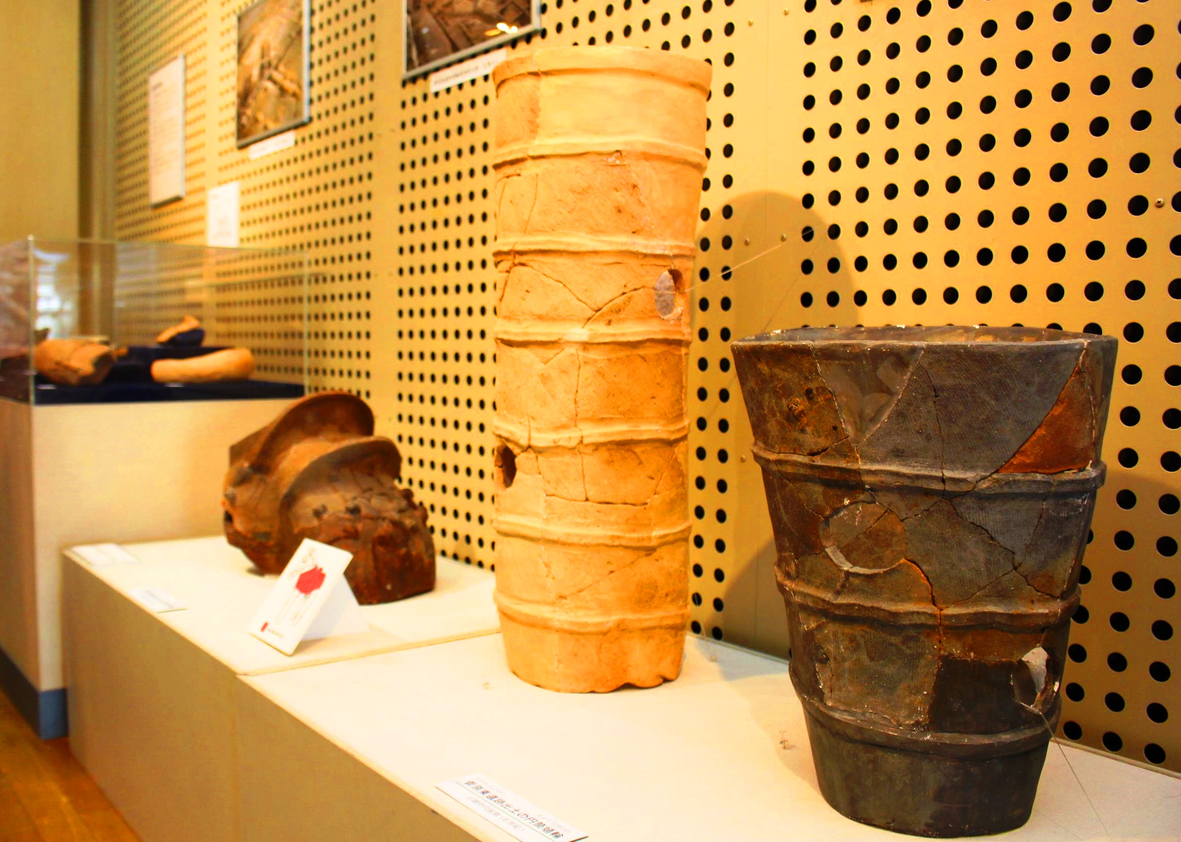 現場周辺は古墳造営などにかかわっていた豪族「土師氏」の本拠地とみられており、登窯や円筒埴輪、陶棺などが出土した。展示では、カメの甲羅のような模様をもつ「亀甲形陶棺」の破片を初めて一般公開。従者が貴人にさしかける傘をかたどった「蓋形埴輪」、高さ80センチにもなる「円筒埴輪」など12点が並んでいる。