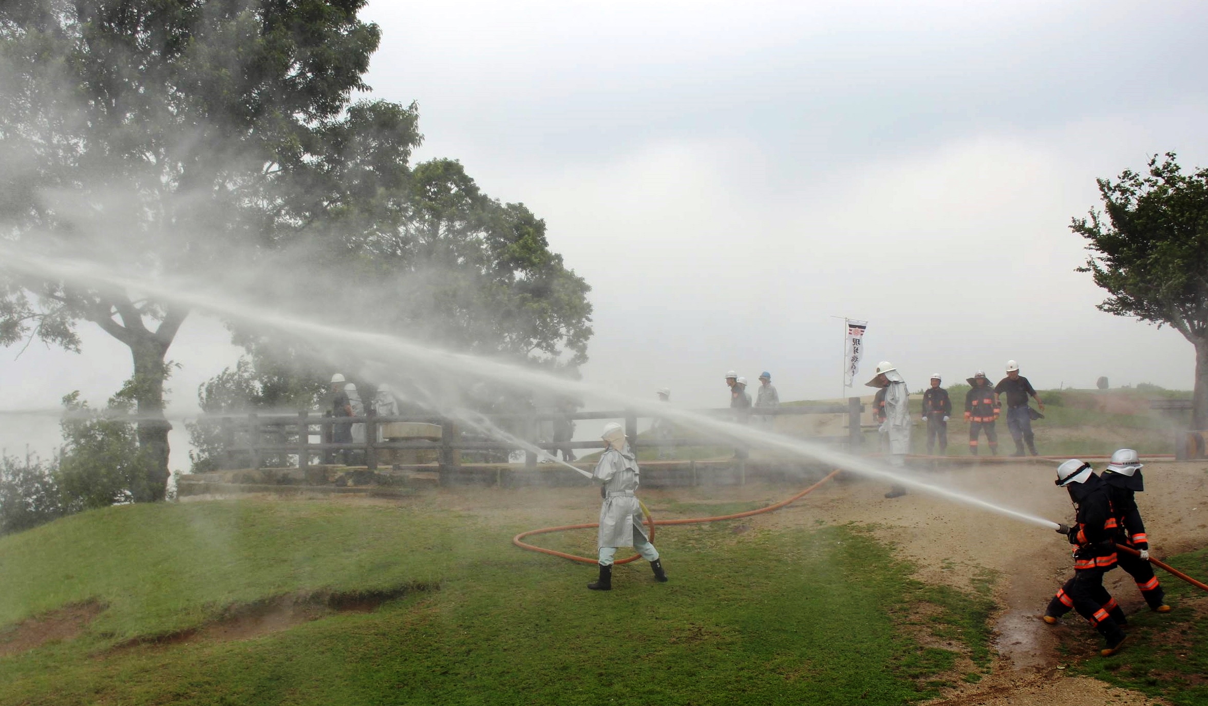 訓練は、若草山の谷間から出火したとの想定で実施。隊員と公園事務所職員らが協力してホースをつなぎ合わせ、山頂や中腹などから谷間に向けて一斉放水した。