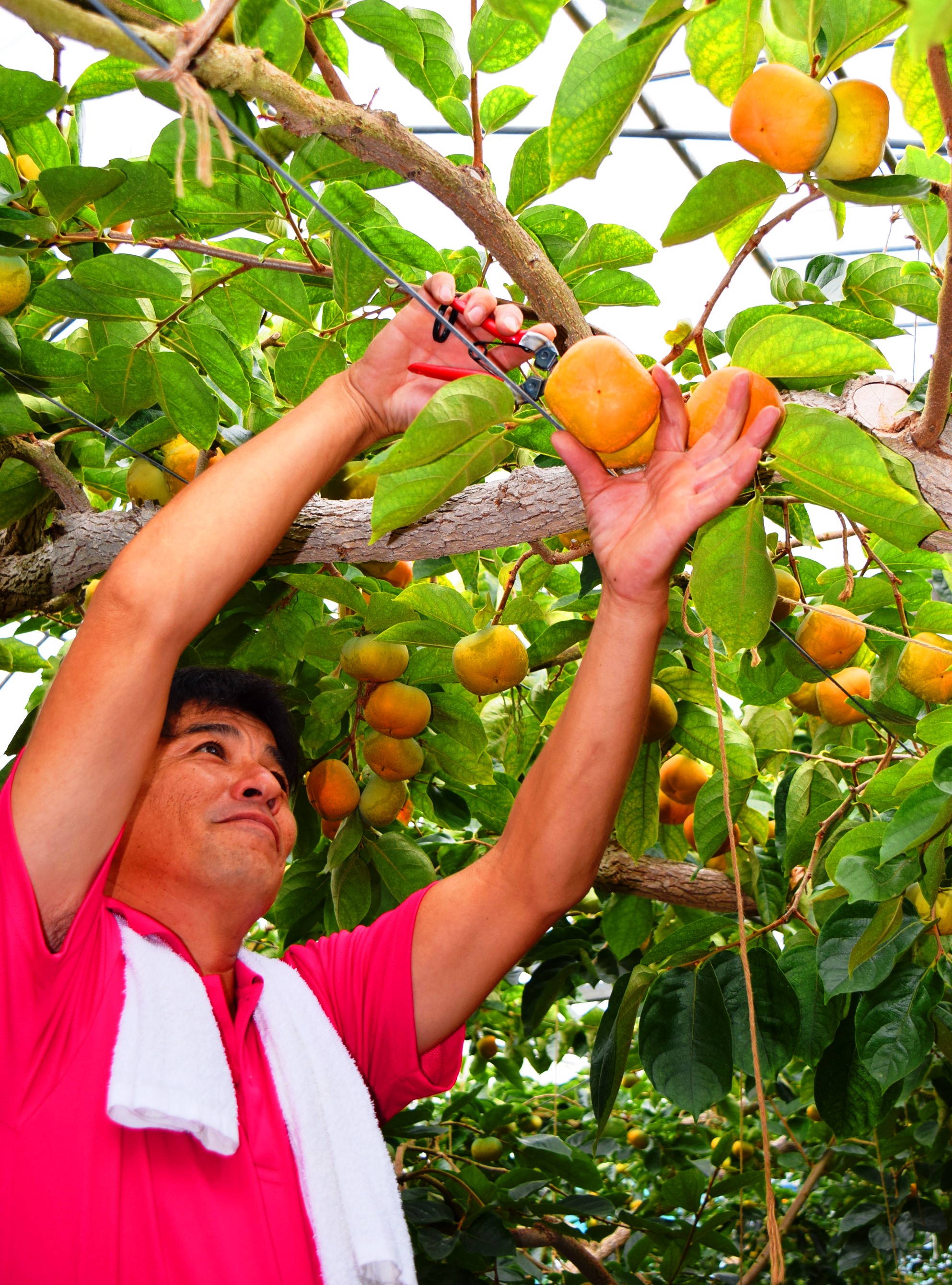 五條市西吉野町の柿農家、辰谷健治さん(43)のハウスでも29日、収穫作業を実施。色づいた柿をていねいに一つずつとり、かごに入れていた。辰谷さんは「一生懸命育ててきた柿を食べていただきたい」と話した。